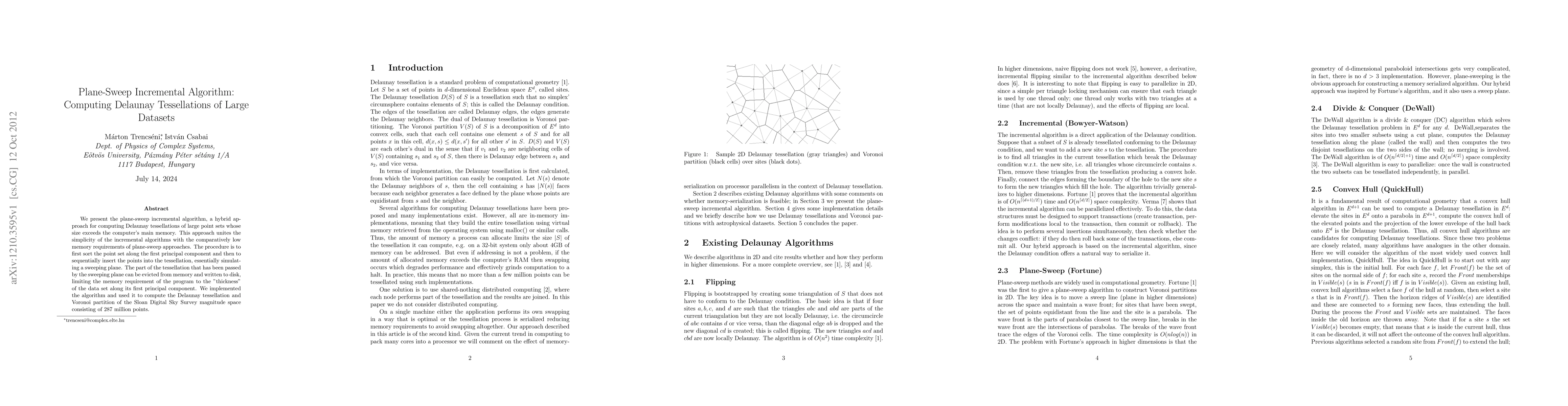 This paper introduces a plane-sweep incremental algorithm for computing Delaunay tessellations of large datasets that exceed main memory capacity. The method combines the simplicity of incremental algorithms with the low memory footprint of plane-sweep techniques, achieving efficient computation by sorting points along the first principal component and simulating a sweeping plane.