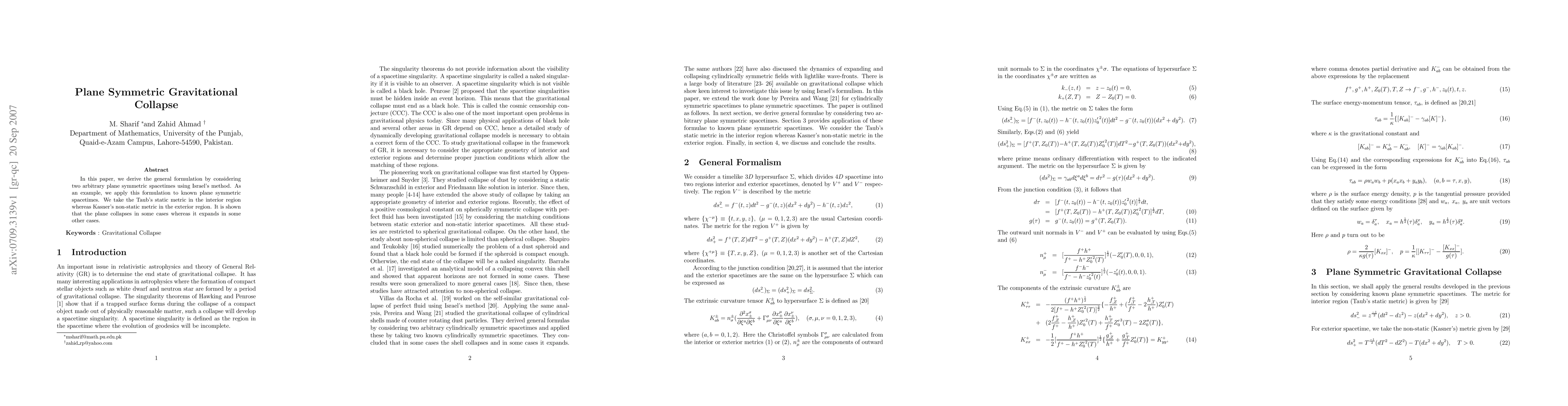 Researchers derive a general formulation for plane symmetric gravitational collapse using Israel's method, showing that in some cases the plane collapses while expanding in others.