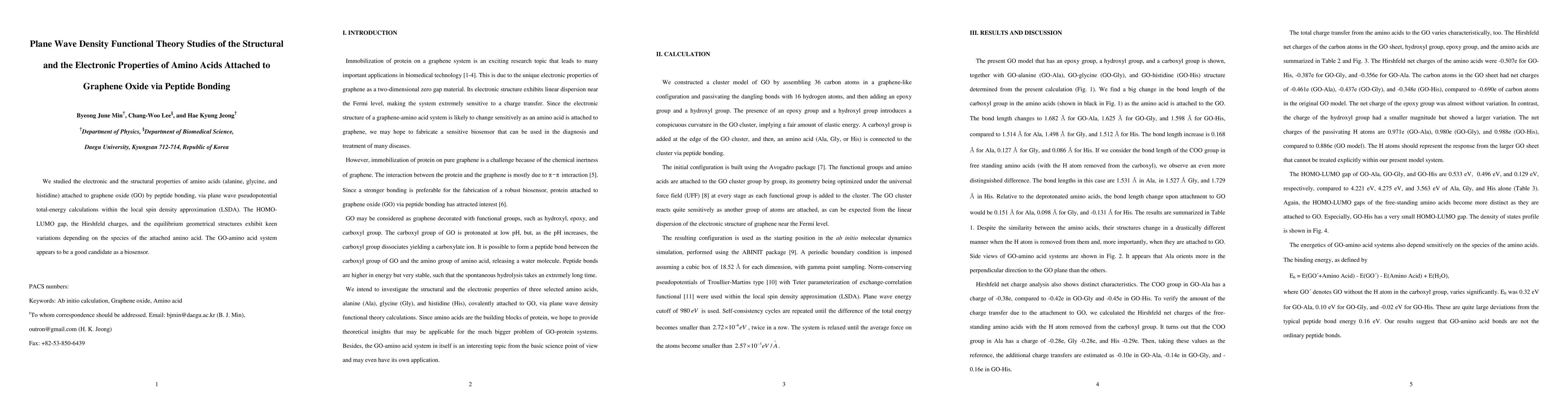 This study investigates the electronic and structural properties of amino acids (alanine, glycine, and histidine) bonded to graphene oxide via peptide linkages using plane wave density functional theory. Significant variations in the HOMO-LUMO gap, Hirshfeld charges, and geometrical structures are observed, indicating potential for the GO-amino acid system as a biosensor.