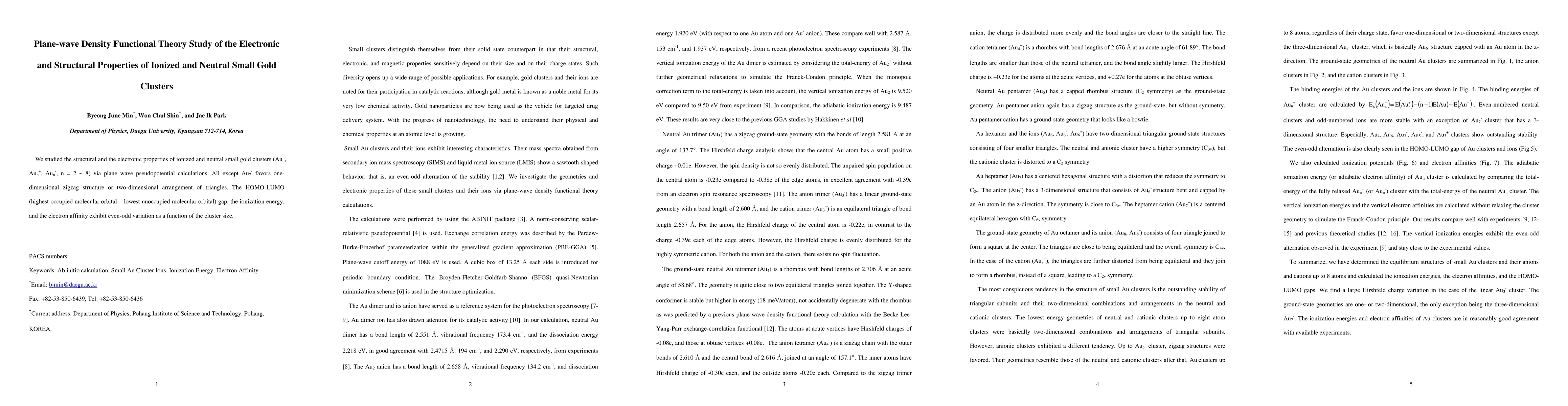 We studied the structural and the electronic properties of ionized and neutral small Au clusters via plane wave pseudopotential calculations. All except the anionic heptamer favor one-dimensional zigzag structures or two-dimensional arrangements of triangles. The HOMO-LUMO (highest occupied molecular orbital - lowest unoccupied molecular orbital) gap, the ionization energy, and the electronic affinity exhibit even-odd variation as a function of the cluster size.