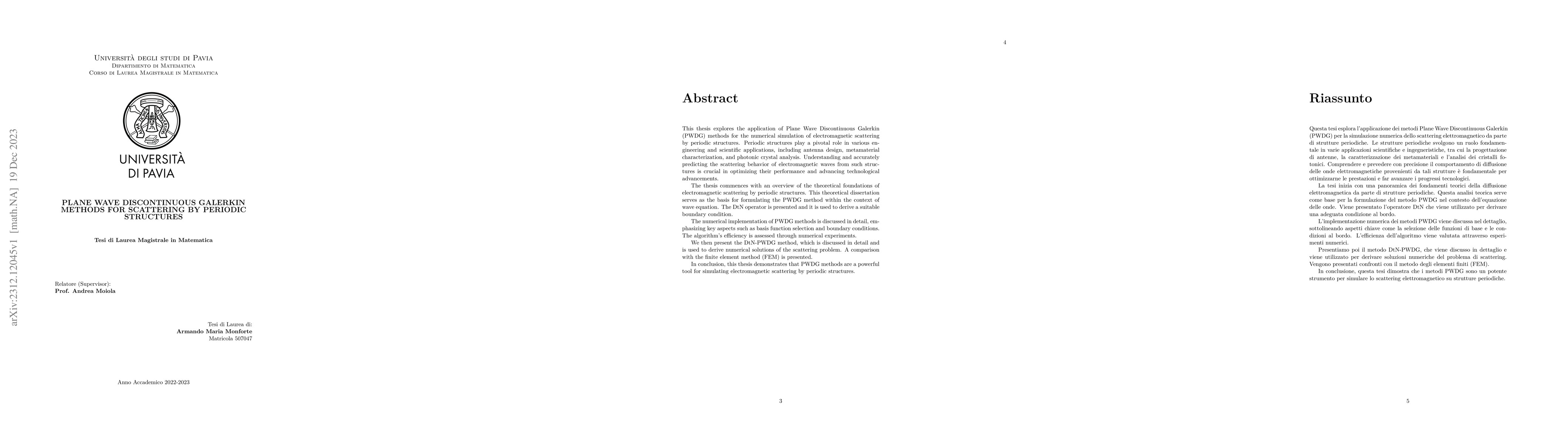 This thesis investigates the Plane Wave Discontinuous Galerkin (PWDG) method for simulating electromagnetic scattering from periodic structures, demonstrating its effectiveness through theoretical foundations, numerical implementation, and comparisons with the finite element method (FEM). The PWDG method is shown to be a robust tool for optimizing the performance of such structures.