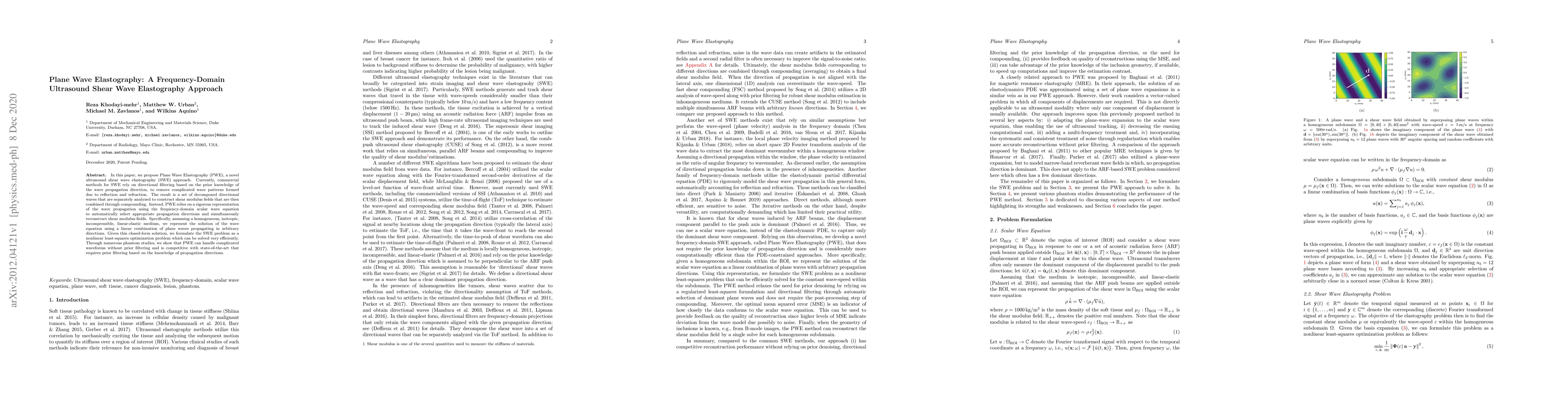 Plane Wave Elastography (PWE) proposes a novel frequency-domain ultrasound shear wave elastography approach that uses a linear combination of plane waves to reconstruct shear modulus fields without directional filtering, demonstrating competitive performance in phantom studies.