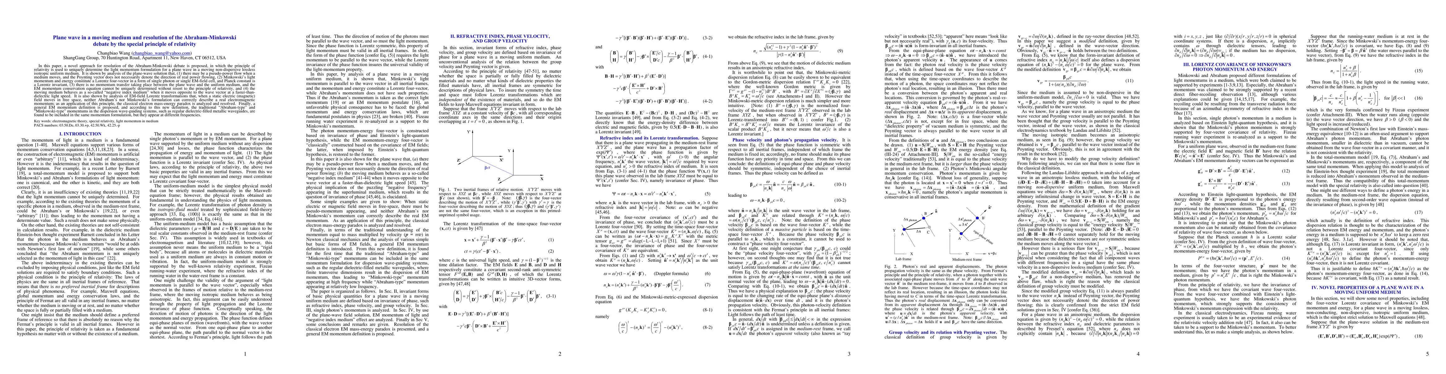 This paper resolves the Abraham-Minkowski debate using the principle of relativity to determine light momentum in a moving medium, showing that Minkowski's formulation constitutes a Lorentz four-vector and that no momentum transfer occurs between the wave and the medium. It also proposes a general EM momentum definition encompassing both traditional formulations at different frequencies.