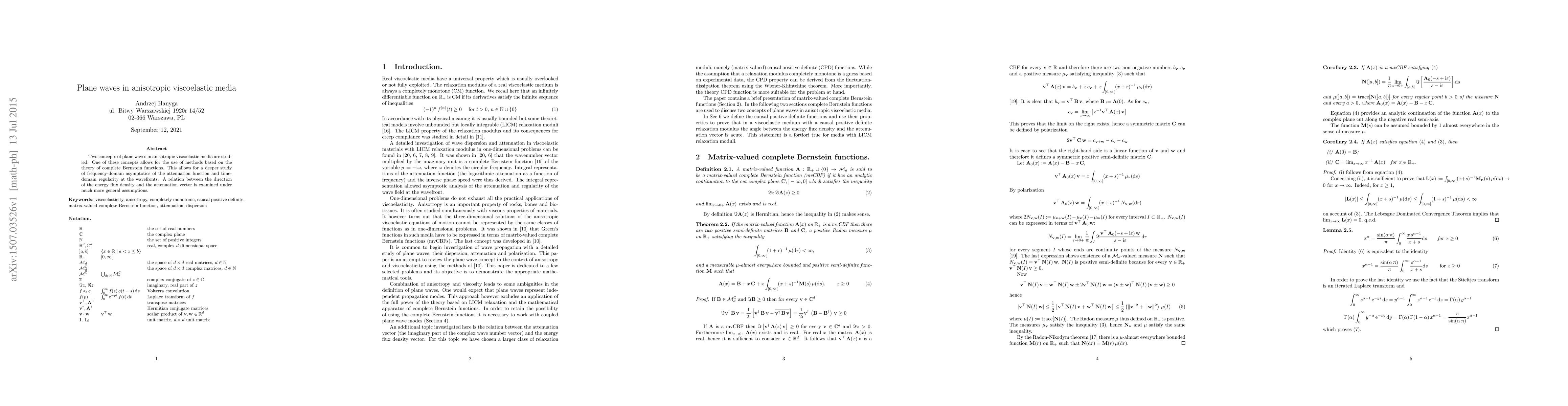 This paper investigates plane waves in anisotropic viscoelastic media, employing methods based on complete Bernstein functions to explore frequency-domain asymptotics and wavefront regularity. It also examines the relationship between energy flux density and attenuation vector under broader assumptions.