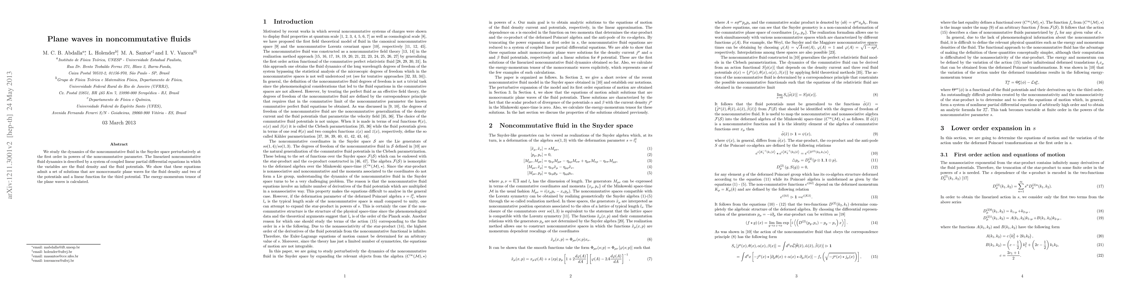 This paper explores the dynamics of noncommutative fluids in Snyder space, revealing that linearized fluid dynamics equations allow for monochromatic plane wave solutions in fluid density and potentials, with the energy-momentum tensor of these waves being calculated.