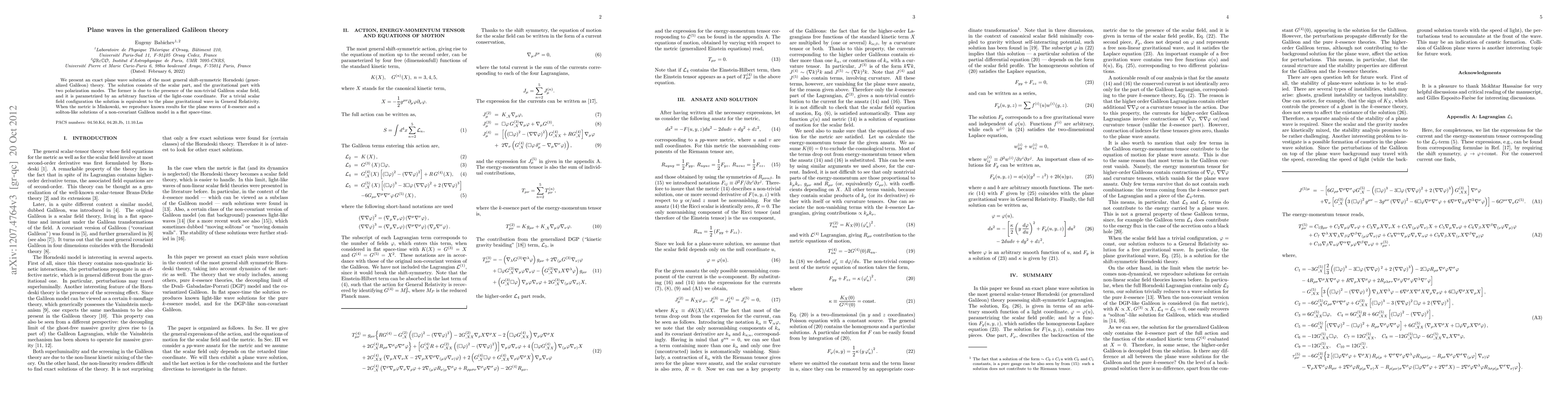 This paper presents an exact plane wave solution for the generalized Galileon theory, featuring both scalar and gravitational components with two polarization modes. The solution includes a non-trivial Galileon scalar field, and under specific conditions, it reduces to known plane wave solutions in General Relativity and k-essence.
