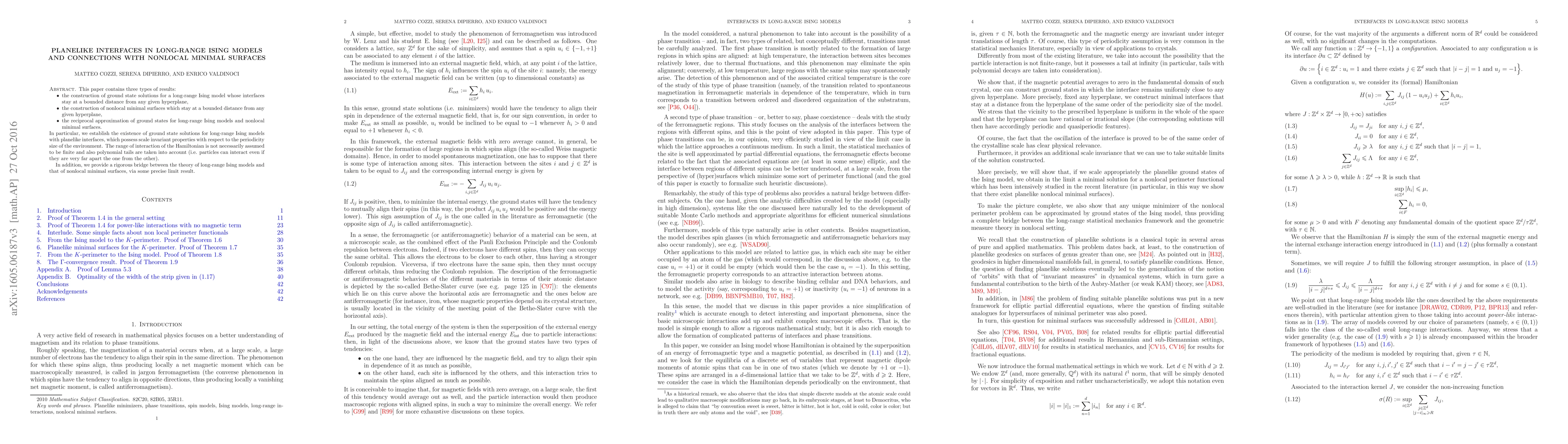 This paper contains three types of results: 1. the construction of ground state solutions for a long-range Ising model whose interfaces stay at a bounded distance from any given hyperplane, 2. the construction of nonlocal minimal surfaces which stay at a bounded distance from any given hyperplane, 3. the reciprocal approximation of ground states for long-range Ising models and nonlocal minimal surfaces. In particular, we establish the existence of ground state solutions for long-range Ising models with planelike interfaces, which possess scale invariant properties with respect to the periodicity size of the environment. The range of interaction of the Hamiltonian is not necessarily assumed to be finite and also polynomial tails are taken into account (i.e. particles can interact even if they are very far apart the one from the other). In addition, we provide a rigorous bridge between the theory of long-range Ising models and that of nonlocal minimal surfaces, via some precise limit result.