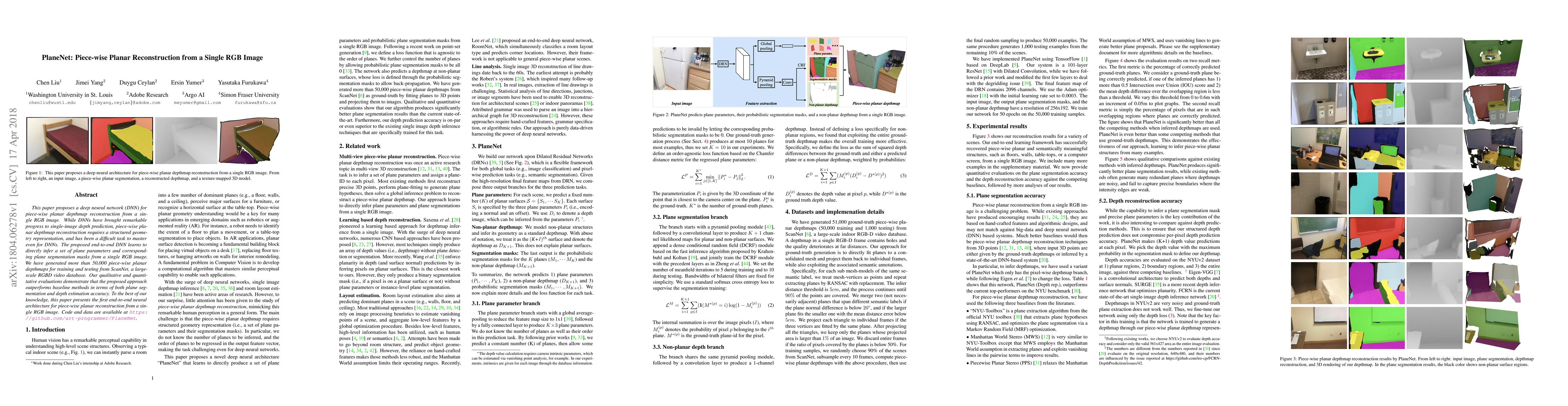 This paper introduces PlaneNet, a deep neural network for reconstructing piece-wise planar depthmaps from a single RGB image, outperforming baseline methods in both plane segmentation and depth estimation accuracy. The approach is the first end-to-end neural architecture for this task, trained and tested on over 50,000 data samples from ScanNet.