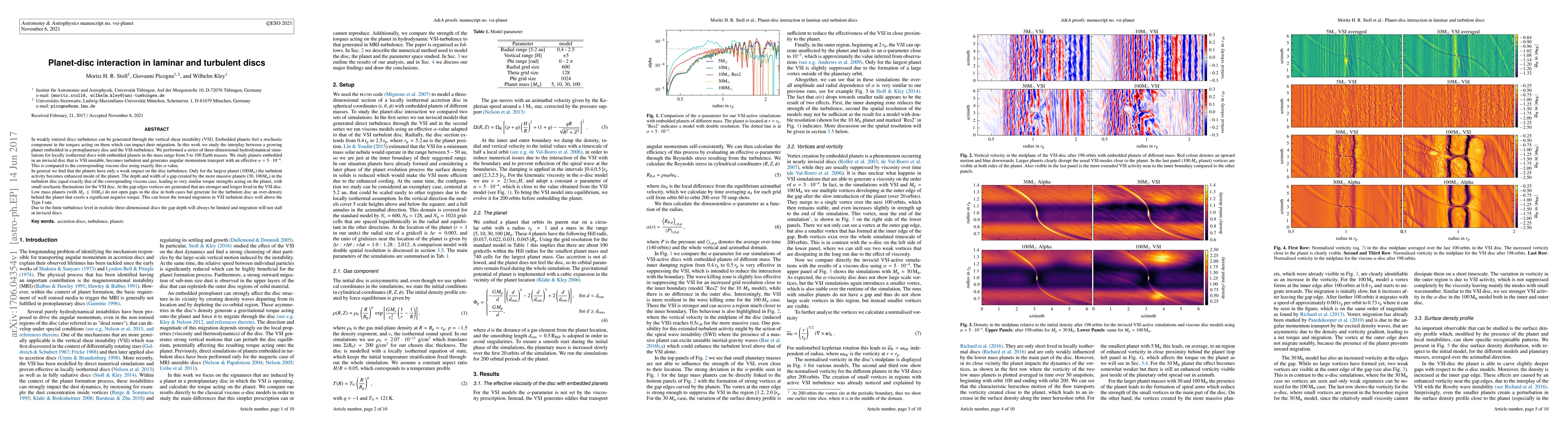 In weakly ionized discs turbulence can be generated through the vertical shear instability (VSI). Embedded planets feel a stochastic component in the torques acting on them which can impact their migration. In this work we study the interplay between a growing planet embedded in a protoplanetary disc and the VSI-turbulence. We performed a series of three-dimensional hydrodynamical simulations for locally isothermal discs with embedded planets in the mass range from 5 to 100 Earth masses. We study planets embedded in an inviscid disc that is VSI unstable, becomes turbulent and generates angular momentum transport with an effective $\alpha = 5 \cdot 10^{-4}$. This is compared to the corresponding viscous disc using exactly this $\alpha$-value. In general we find that the planets have only a weak impact on the disc turbulence. Only for the largest planet ($100 M_\oplus$) the turbulent activity becomes enhanced inside of the planet. The depth and width of a gap created by the more massive planets ($30, 100 M_\oplus$) in the turbulent disc equal exactly that of the corresponding viscous case, leading to very similar torque strengths acting on the planet, with small stochastic fluctuations for the VSI disc. At the gap edges vortices are generated that are stronger and longer lived in the VSI disc. Low mass planets (with $M_p \leq 10 M_\oplus$) do not open gaps in the disc in both cases but generate for the turbulent disc an over-density behind the planet that exerts a significant negative torque. This can boost the inward migration in VSI turbulent discs well above the Type I rate. Due to the finite turbulence level in realistic three-dimensional discs the gap depth will always be limited and migration will not stall in inviscid discs.