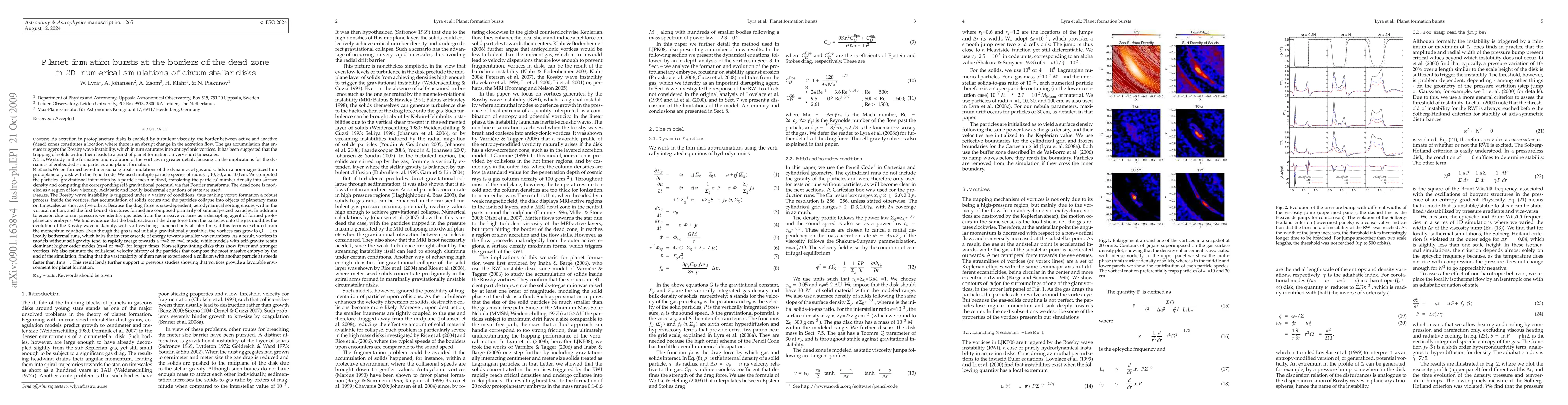 This study uses 2D simulations to show that planet formation bursts occur at the borders of the dead zone in protoplanetary disks due to Rossby wave instability triggering anticyclonic vortices. These vortices rapidly accumulate solids, leading to the formation of planetary-mass objects within just five orbits.
