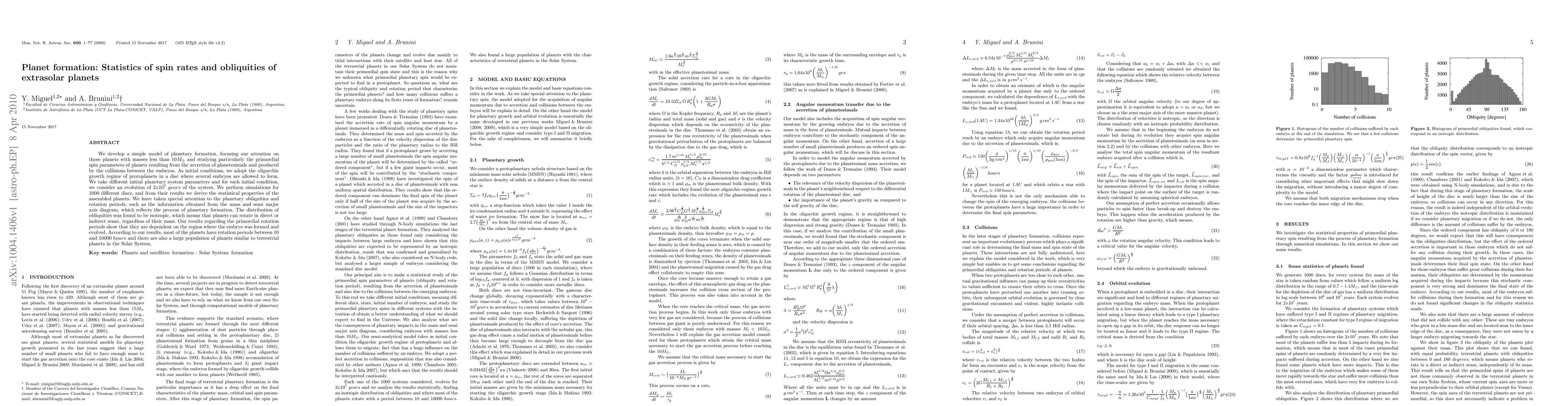This research develops a model to study the formation of planets with masses less than 10 Earth masses, focusing on their spin rates and obliquities. It finds that planetary obliquities are isotropic, allowing for both direct and indirect rotations, while primordial rotation periods depend on the formation region, with most planets having rotation periods between 10 and 10,000 hours.