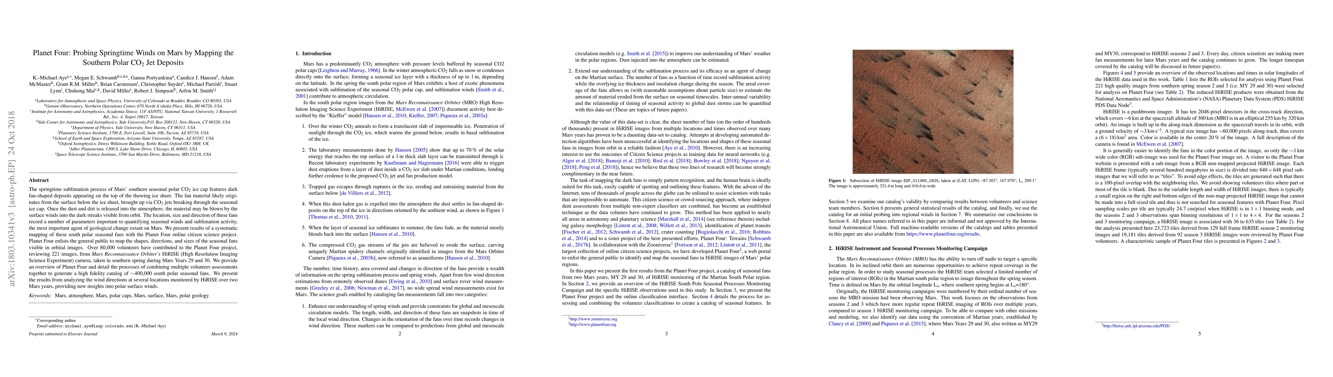 This paper investigates Mars' southern seasonal polar CO$_2$ jet deposits and their relation to springtime winds, using data from the Planet Four citizen science project. The study systematically maps fan-shaped deposits formed by CO$_2$ jets, revealing insights into seasonal wind patterns and sublimation activity on Mars.