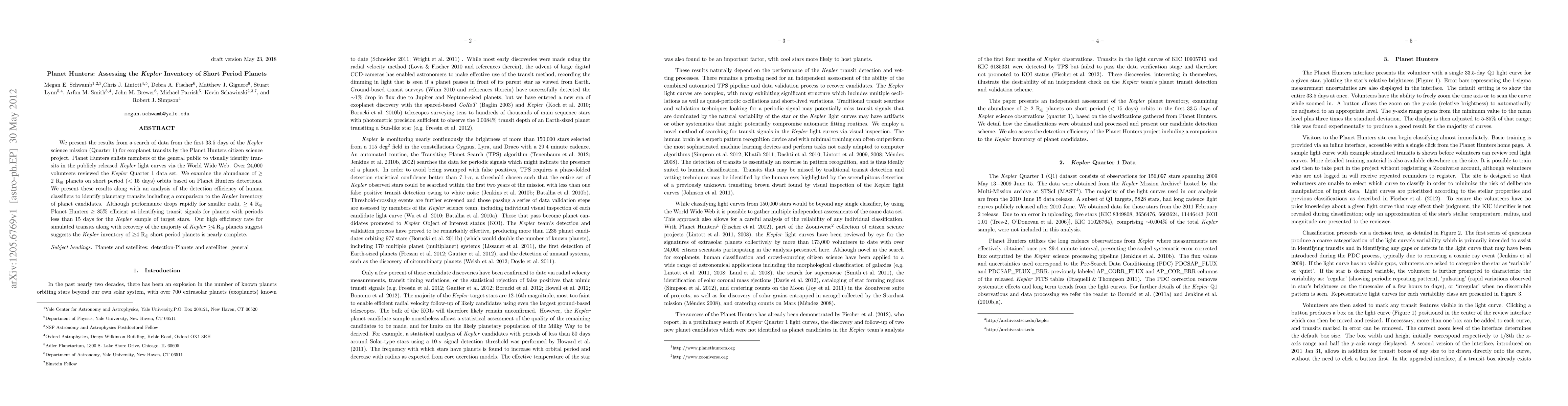 The Planet Hunters project identified exoplanet transits in Kepler's Quarter 1 data, enlisting 24,000 volunteers to review light curves. The study found high efficiency (>85%) in detecting ≥4 R⊕ planets with periods <15 days, suggesting the Kepler inventory of such short-period planets is nearly complete.