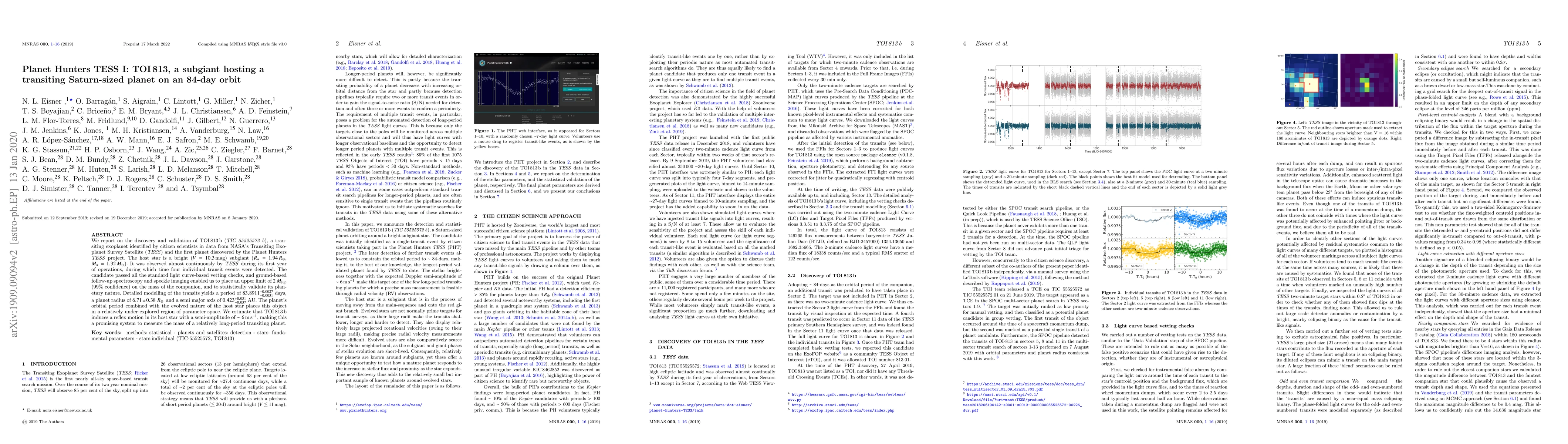 The Planet Hunters TESS project discovered TOI 813b, a Saturn-sized planet orbiting a subgiant star in an 84-day orbit, validated through TESS data and ground-based observations. The planet's mass is constrained to below 2 Jupiter masses, making it a promising target for future mass measurements.