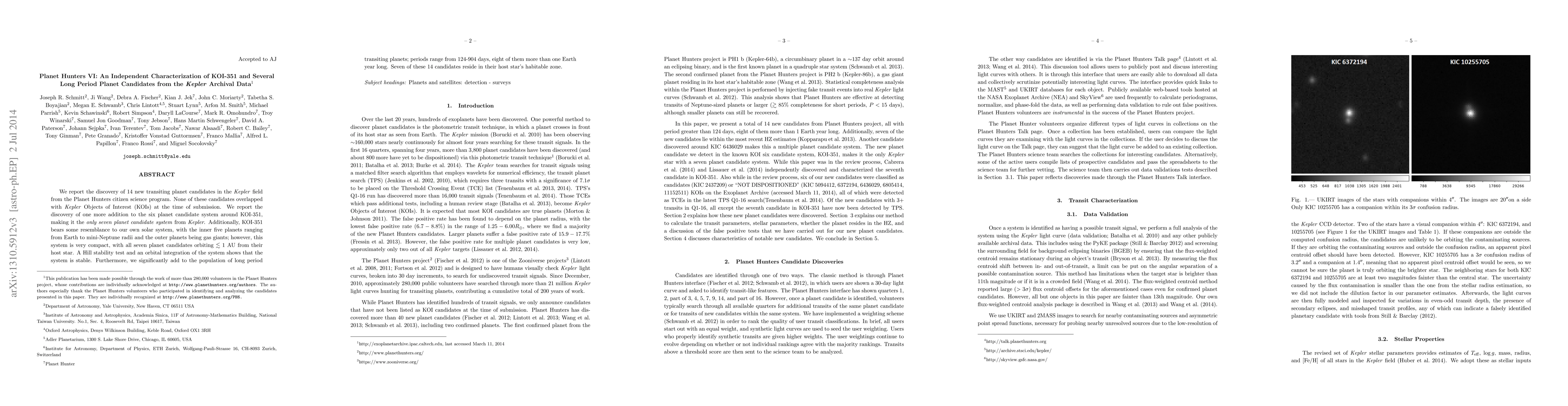 We report the discovery of 14 new transiting planet candidates in the Kepler field from the Planet Hunters citizen science program. None of these candidates overlapped with Kepler Objects of Interest (KOIs) at the time of submission. We report the discovery of one more addition to the six planet candidate system around KOI-351, making it the only seven planet candidate system from Kepler. Additionally, KOI-351 bears some resemblance to our own solar system, with the inner five planets ranging from Earth to mini-Neptune radii and the outer planets being gas giants; however, this system is very compact, with all seven planet candidates orbiting $\lesssim 1$ AU from their host star. A Hill stability test and an orbital integration of the system shows that the system is stable. Furthermore, we significantly add to the population of long period transiting planets; periods range from 124-904 days, eight of them more than one Earth year long. Seven of these 14 candidates reside in their host star's habitable zone.