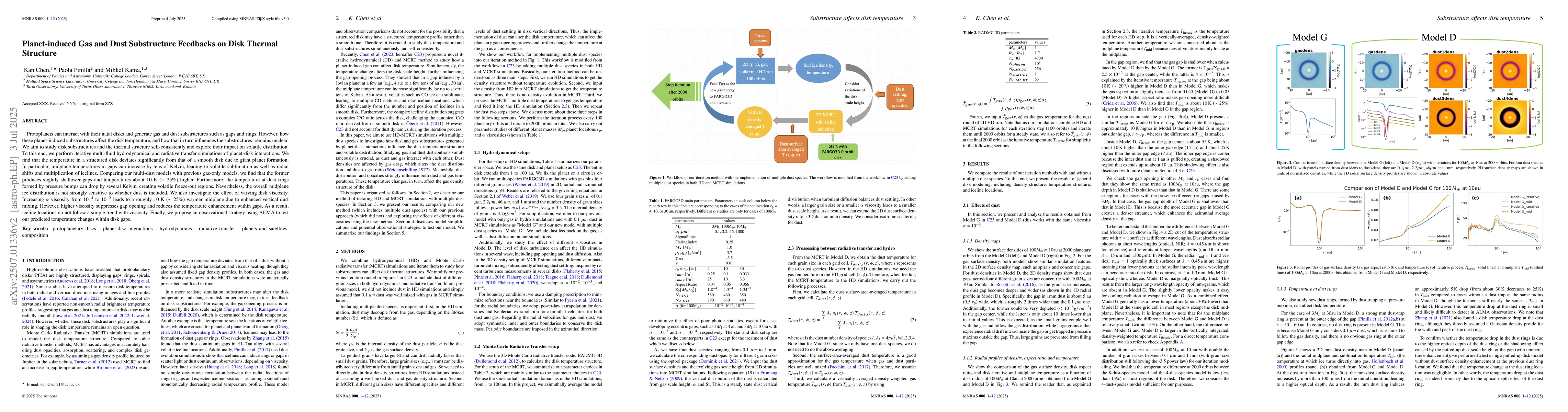 Protoplanets can interact with their natal disks and generate gas and dust substructures such as gaps and rings. However, how these planet-induced substructures affect the disk temperature, and how that in turn influences the substructures, remains unclear. We aim to study disk substructures and the thermal structure self-consistently and explore their impact on volatile distribution. To this end, we perform iterative multi-fluid hydrodynamical and radiative transfer simulations of planet-disk interactions. We find that the temperature in a structured disk deviates significantly from that of a smooth disk due to giant planet formation. In particular, midplane temperatures in gaps can increase by tens of Kelvin, leading to volatile sublimation as well as radial shifts and multiplication of icelines. Comparing our multi-dust models with previous gas-only models, we find that the former produces slightly shallower gaps and temperatures about 10 K ($\sim25\%$) higher. Furthermore, the temperature at dust rings formed by pressure bumps can drop by several Kelvin, creating volatile freeze-out regions. Nevertheless, the overall midplane ice distribution is not strongly sensitive to whether dust is included. We also investigate the effect of varying disk viscosity. Increasing $\alpha$ viscosity from $10^{-4}$ to $10^{-2}$ leads to a roughly 10 K ($\sim25\%$) warmer midplane due to enhanced vertical dust mixing. However, higher viscosity suppresses gap opening and reduces the temperature enhancement within gaps. As a result, iceline locations do not follow a simple trend with viscosity. Finally, we propose an observational strategy using ALMA to test our predicted temperature changes within disk gaps.