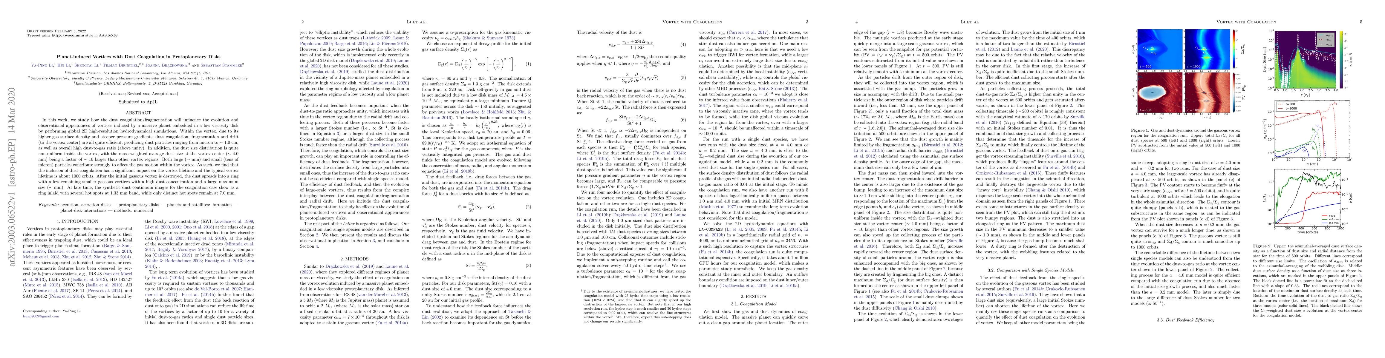 This study investigates the impact of dust coagulation and fragmentation on vortices induced by a massive planet in a low viscosity protoplanetary disk through high-resolution 2D hydrodynamical simulations. The results show that vortices efficiently produce dust particles ranging from microns to 1 cm, leading to a high dust-to-gas ratio and a non-uniform dust size distribution, with larger particles at the vortex center. The inclusion of dust coagulation significantly extends the vortex lifetime to about 1000 orbits.