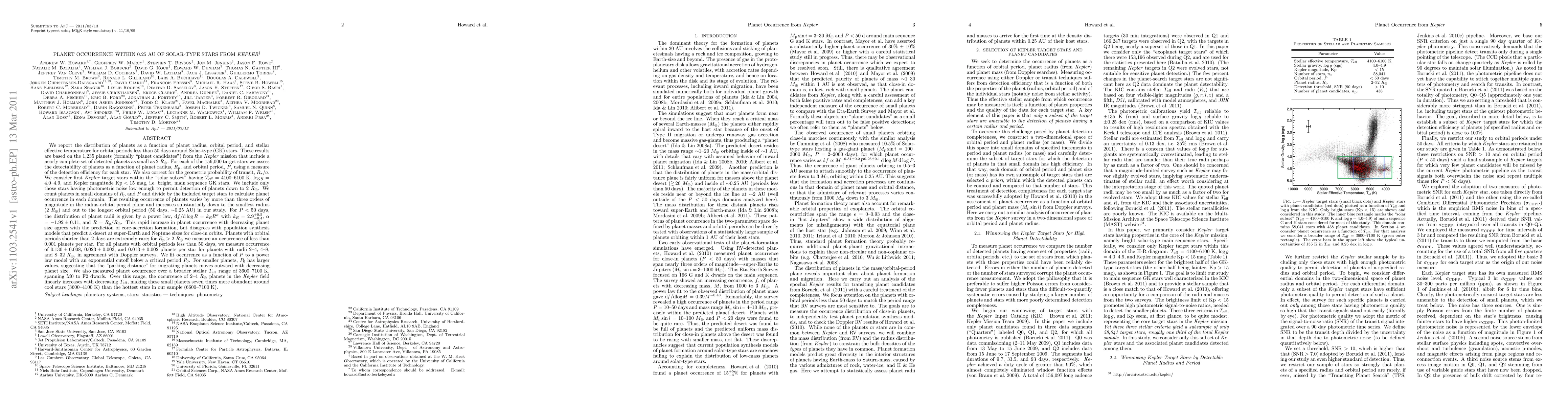 This study analyzes the occurrence of planets within 0.25 AU of solar-type stars using Kepler mission data, finding a significant increase in planet occurrence for smaller planets and longer periods. The occurrence rate varies greatly, with small planets (2 Earth radii) being more abundant around cooler stars.