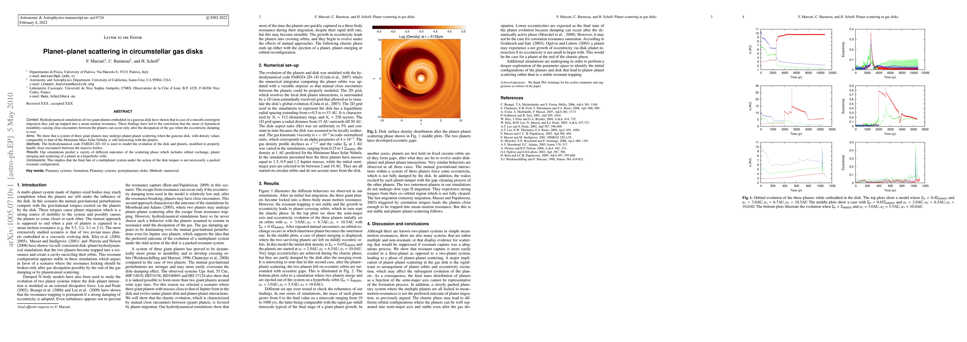This paper demonstrates that planet-planet scattering can occur in gaseous disks with densities similar to the Minimum Mass Solar Nebula, challenging the belief that such scattering only happens after gas dissipation. Using hydrodynamical simulations, it shows diverse outcomes including orbital exchange, planet merging, and ejection, indicating that resonant configurations are not the only possible fates of multiplanet systems.