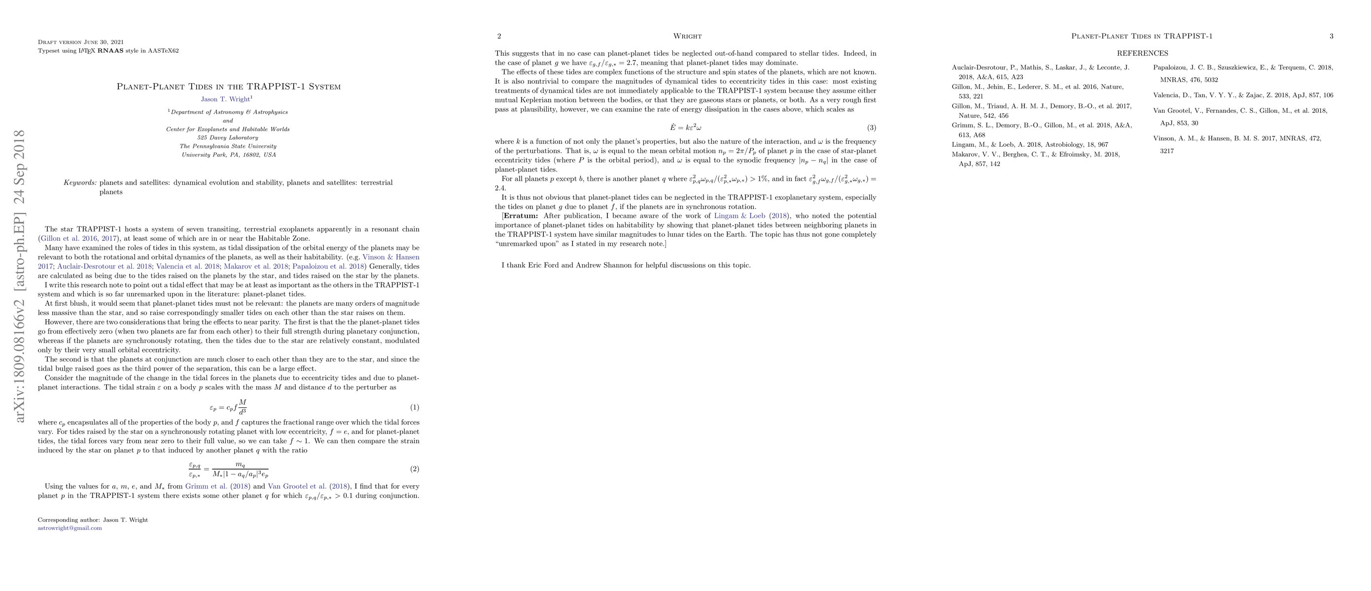 The star TRAPPIST-1 hosts a system of seven transiting, terrestrial exoplanets apparently in a resonant chain, at least some of which are in or near the Habitable Zone. Many have examined the roles of tides in this system, as tidal dissipation of the orbital energy of the planets may be relevant to both the rotational and orbital dynamics of the planets, as well as their habitability. Generally, tides are calculated as being due to the tides raised on the planets by the star, and tides raised on the star by the planets. I write this research note to point out a tidal effect that may be at least as important as the others in the TRAPPIST-1 system and which is so far unremarked upon in the literature: planet-planet tides. Under some reasonable assumptions, I find that for every planet $p$ in the TRAPPIST-1 system there exists some other planet $q$ for which the planet-planet dynamical tidal strain is within an order of magnitude of the stellar eccentricity tidal strain, and that the effects of planet $f$ on planet $g$ are in fact greater than that of the star on planet $g$. It is thus not obvious that planet-planet tides can be neglected in the TRAPPIST-1 exoplanetary system, especially the tides on planet $g$ due to planet $f$, if the planets are in synchronous rotation.