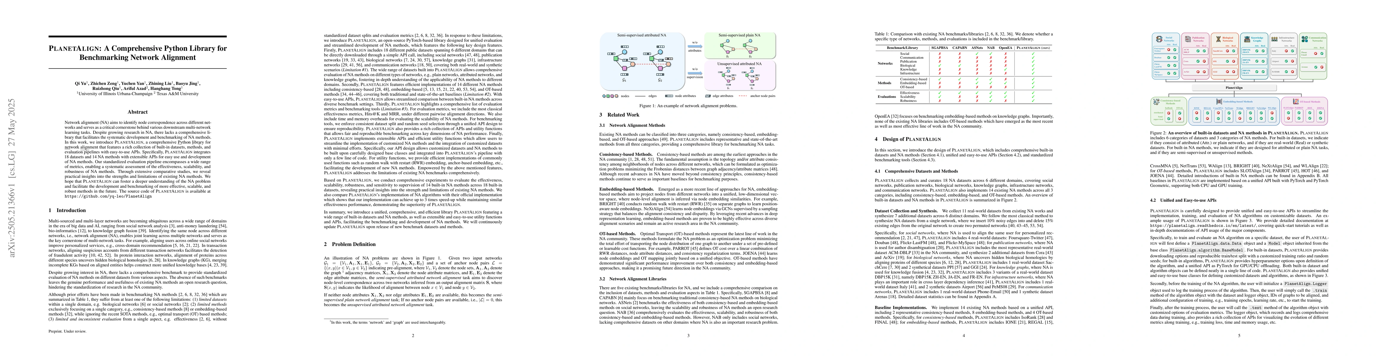 PLANETALIGN provides a comprehensive, extensible Python library for benchmarking network alignment methods, including datasets, methods, and evaluation pipelines.