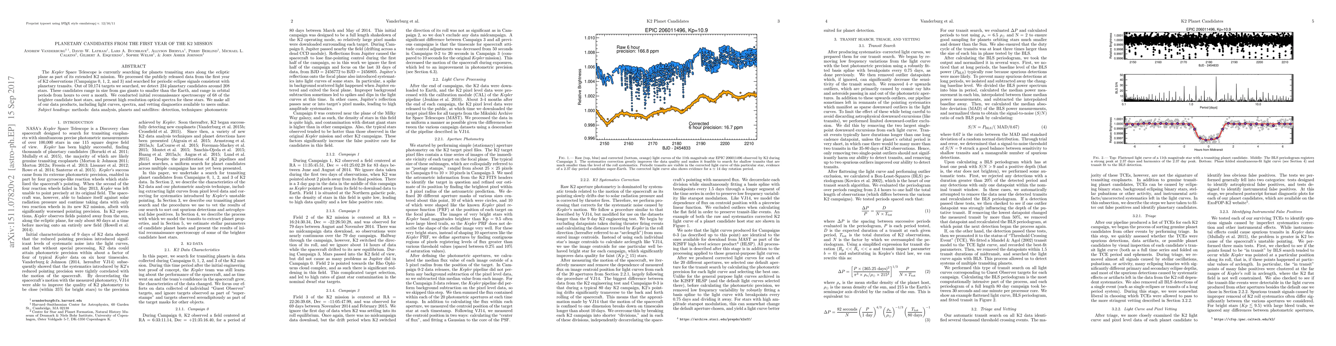 The K2 mission of the Kepler Space Telescope identified 234 planetary candidates from the first year of observations, ranging from gas giants to Earth-sized planets. Initial spectroscopic analysis of 68 candidate host stars was conducted, and all data products are publicly available online.