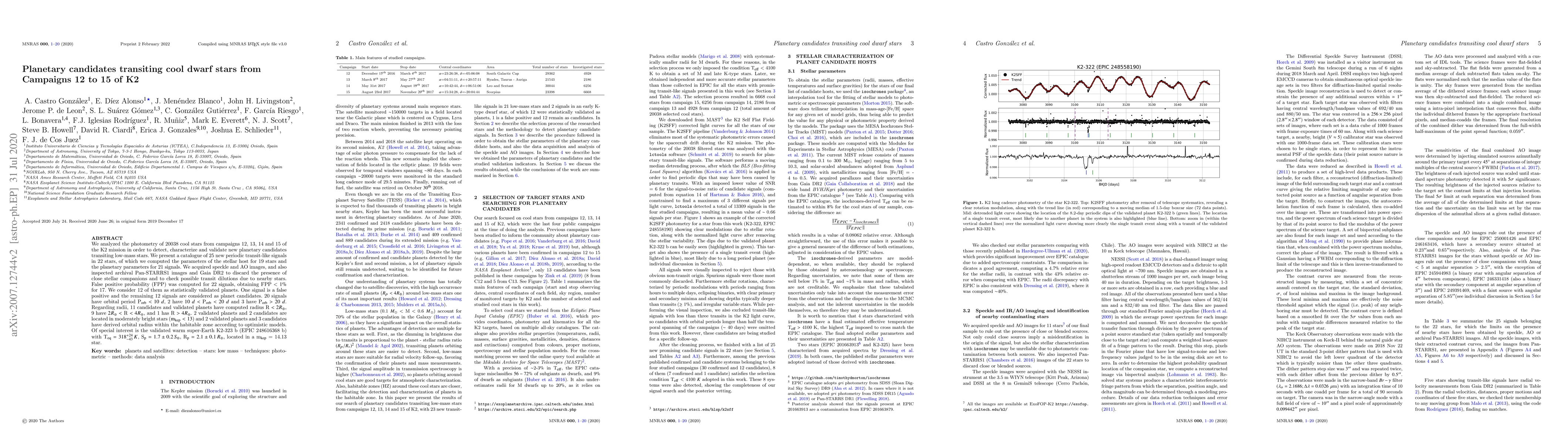 The study analyzed K2 photometry of 20038 cool stars from Campaigns 12 to 15 to detect and characterize new planetary candidates transiting low-mass stars. Stellar and planetary parameters were computed for 19 and 21 signals, respectively, with false positive probabilities (FPP) calculated for 22 signals.