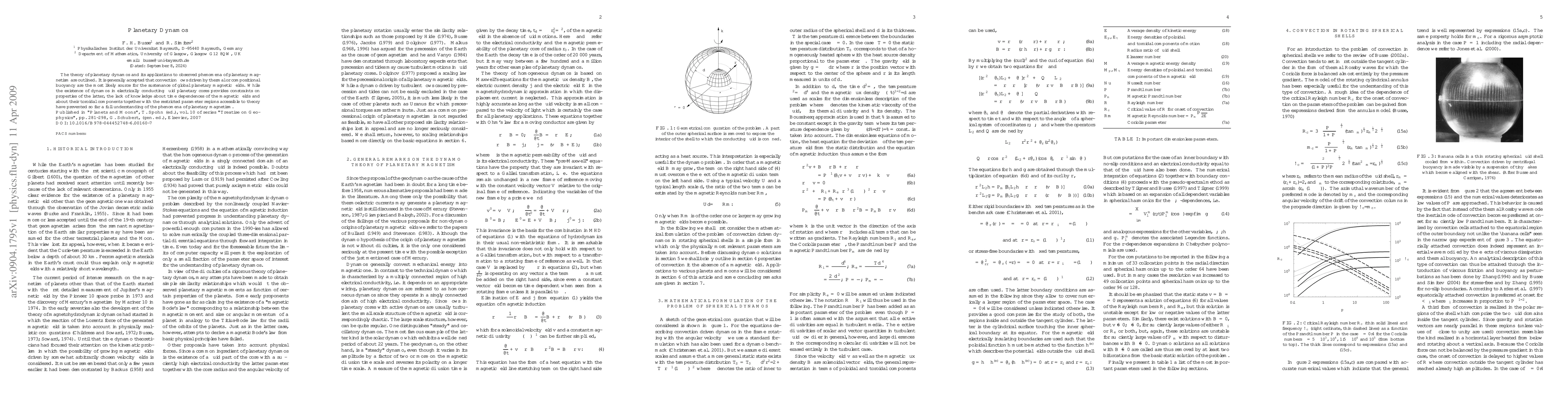 This paper outlines the theory of planetary dynamos and their role in sustaining global planetary magnetic fields, primarily driven by convection flows in planetary cores. Despite constraints on core properties, a full understanding of the time-dependent and toroidal components of planetary magnetic fields remains elusive.