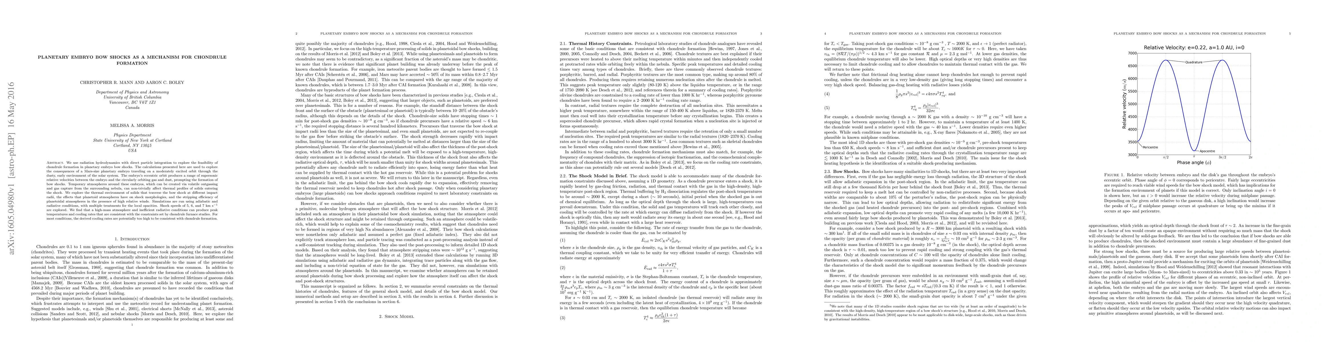 This paper investigates the potential for chondrule formation through planetary embryo bow shocks using radiation hydrodynamics simulations. It finds that high-mass atmospheres and inefficient radiative conditions can produce peak temperatures consistent with chondrule formation, though most conditions result in cooling rates too high for chondrule formation.