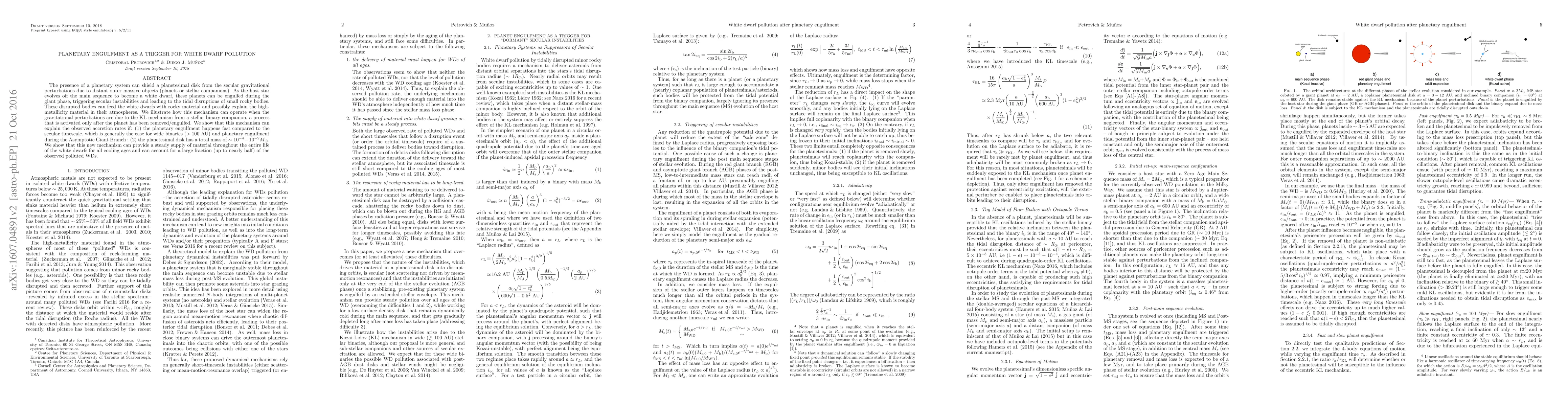 The presence of a planetary system can shield a planetesimal disk from the secular gravitational perturbations due to distant outer massive objects (planets or stellar companions). As the host star evolves off the main sequence to become a white dwarf, these planets can be engulfed, triggering secular instabilities and leading to the tidal disruptions of small rocky bodies. These disrupted bodies can feed the white dwarfs with rocky material and possibly explain the high-metallicity material in their atmospheres. We illustrate how this mechanism can operate when the gravitational perturbations are due to the Kozai-Lidov mechanism from a stellar binary companion. We show that this mechanism can explain the observed levels of accretion if: (1) the planetary engulfment happens fast compared to the secular timescale, which is generally the case for wide binaries ($>100$ AU) and planetary engulfment during the Asymptotic Giant Branch; (2) the planetesimal disk has a total mass of $\sim10^{-4}-10^{-2}M_\oplus$. We show that this new mechanism can provide a steady supply of material throughout the entire life of the white dwarfs for all cooling ages and can account for a large fraction (up to nearly half) of the observed polluted WDs.
