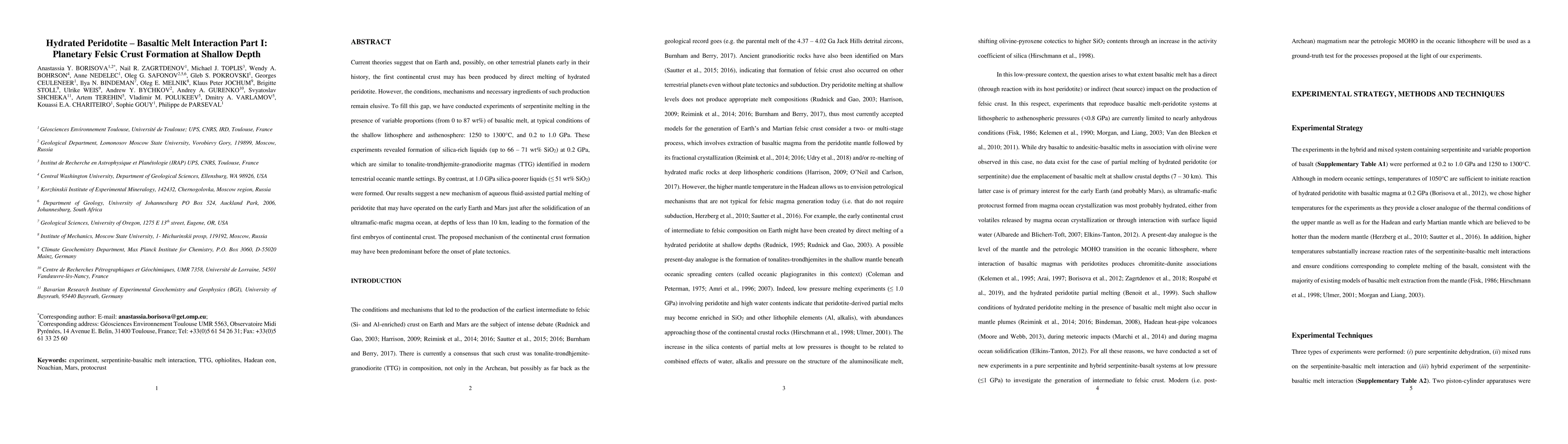 Current theories suggest that on Earth and, possibly, on other terrestrial planets early in their history, the first continental crust may has been produced by direct melting of hydrated peridotite. However, the conditions, mechanisms and necessary ingredients of such production remain elusive. To fill this gap, we have conducted experiments of serpentinite melting in the presence of variable proportions of basaltic melt, at typical conditions of the shallow lithosphere and asthenosphere. These experiments revealed formation of silica-rich liquids, which are similar to tonalite-trondhjemite-granodiorite magmas (TTG) identified in modern terrestrial oceanic mantle settings. Our results suggest a new mechanism of aqueous fluid-assisted partial melting of peridotite that may have operated on the early Earth and Mars just after the solidification of an ultramafic-mafic magma ocean, leading to the formation of the first embryos of continental crust. The proposed mechanism of the continental crust formation may have been predominant before the onset of plate tectonics.