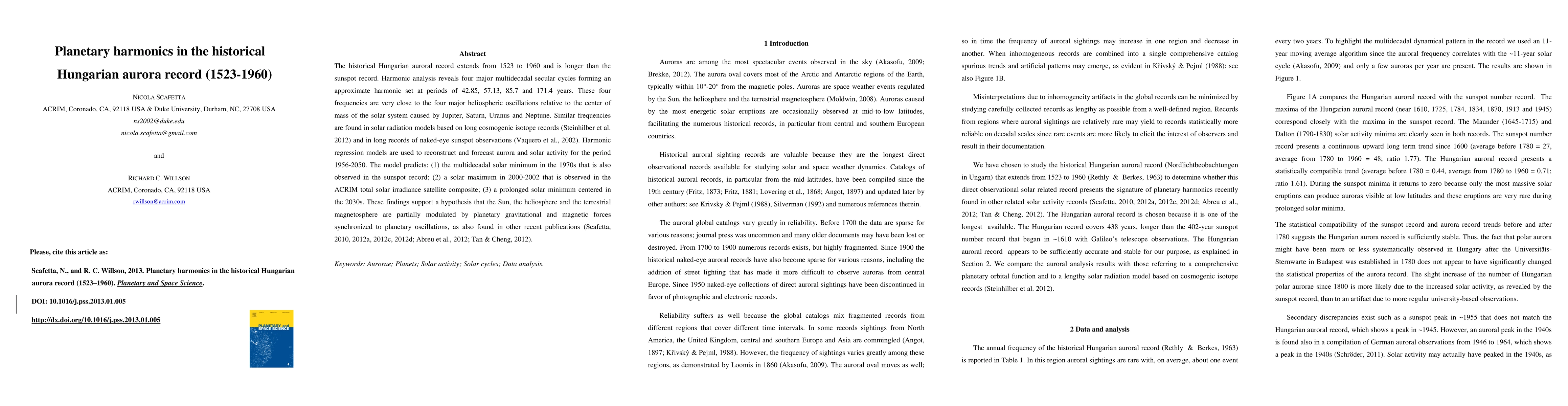 The historical Hungarian auroral record extends from 1523 to 1960 and is longer than the sunspot record. Harmonic analysis reveals four major multidecadal secular cycles forming an approximate harmonic set at periods of 42.85, 57.13, 85.7 and 171.4 years. These four frequencies are very close to the four major heliospheric oscillations relative to the center of mass of the solar system caused by Jupiter, Saturn, Uranus and Neptune. Similar frequencies are found in solar radiation models based on long cosmogenic isotope records (Steinhilber et al. 2012) and in long records of naked-eye sunspot observations (Vaquero et al., 2002). Harmonic regression models are used to reconstruct and forecast aurora and solar activity for the period 1956-2050. The model predicts: (1) the multidecadal solar minimum in the 1970s that is also observed in the sunspot record; (2) a solar maximum in 2000-2002 that is observed in the ACRIM total solar irradiance satellite composite; (3) a prolonged solar minimum centered in the 2030s. These findings support a hypothesis that the Sun, the heliosphere and the terrestrial magnetosphere are partially modulated by planetary gravitational and magnetic forces synchronized to planetary oscillations, as also found in other recent publications (Scafetta, 2010, 2012a, 2012c, 2012d; Abreu et al., 2012; Tan & Cheng, 2012).