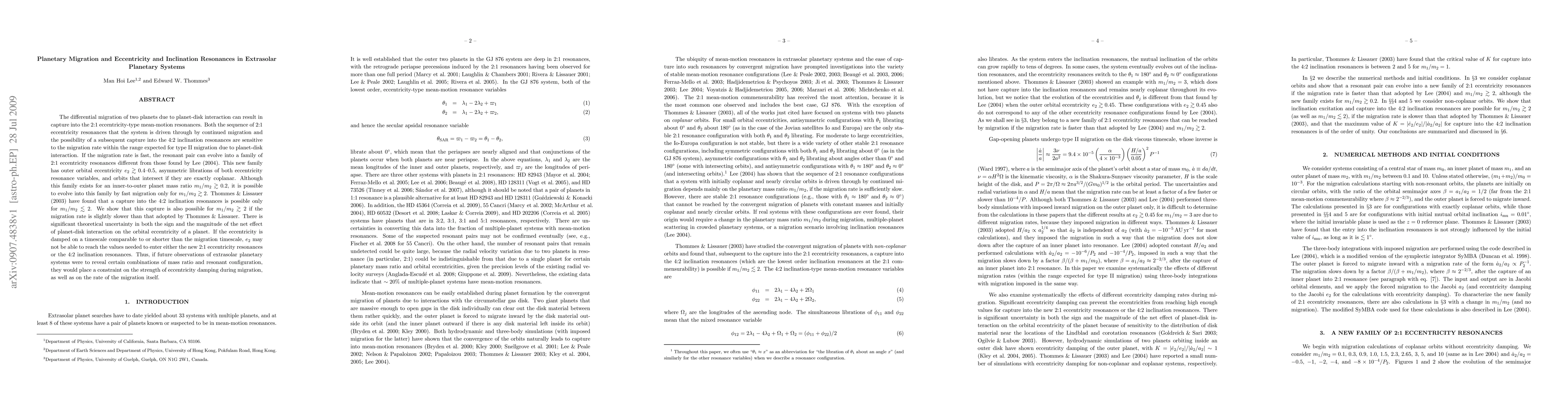 The differential migration of two planets due to planet-disk interaction can result in capture into the 2:1 eccentricity-type mean-motion resonances. Both the sequence of 2:1 eccentricity resonances that the system is driven through by continued migration and the possibility of a subsequent capture into the 4:2 inclination resonances are sensitive to the migration rate within the range expected for type II migration. If the migration rate is fast, the resonant pair can evolve into a family of 2:1 eccentricity resonances different from those found by Lee (2004). This new family has outer orbital eccentricity e_2 > 0.4-0.5, asymmetric librations of both eccentricity resonance variables, and orbits that intersect if they are exactly coplanar. Although this family exists for an inner-to-outer planet mass ratio m_1/m_2 > 0.2, it is possible to evolve into this family by fast migration only for m_1/m_2 > 2. Thommes and Lissauer (2003) have found that a capture into the 4:2 inclination resonances is possible only for m_1/m_2 < 2. We show that this capture is also possible for m_1/m_2 > 2 if the migration rate is slightly slower than that adopted by Thommes and Lissauer. There is significant theoretical uncertainty in both the sign and the magnitude of the net effect of planet-disk interaction on the orbital eccentricity of a planet. If the eccentricity is damped on a timescale comparable to or shorter than the migration timescale, e_2 may not be able to reach the values needed to enter either the new 2:1 eccentricity resonances or the 4:2 inclination resonances. Thus, if future observations of extrasolar planetary systems were to reveal certain combinations of mass ratio and resonant configuration, they would place a constraint on the strength of eccentricity damping during migration, as well as on the migration rate itself.