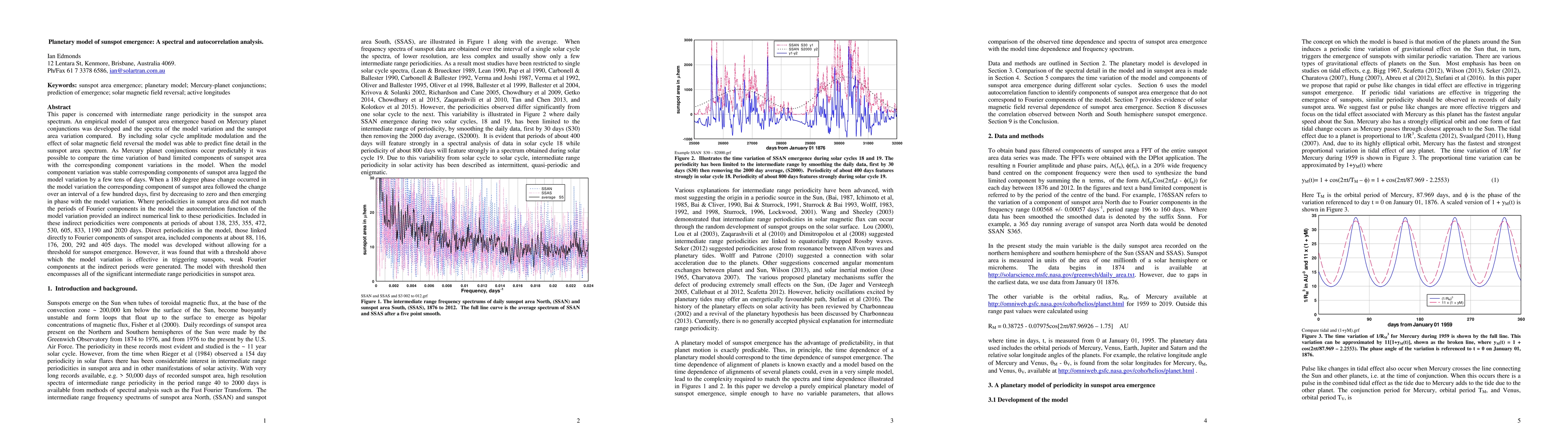This paper develops an empirical model of sunspot emergence based on Mercury planet conjunctions, comparing its spectral and autocorrelation analysis with sunspot area variations. The model, incorporating solar cycle modulation and magnetic field reversal, predicts intermediate range periodicities in sunspot emergence, matching observed indirect and direct periodicities.