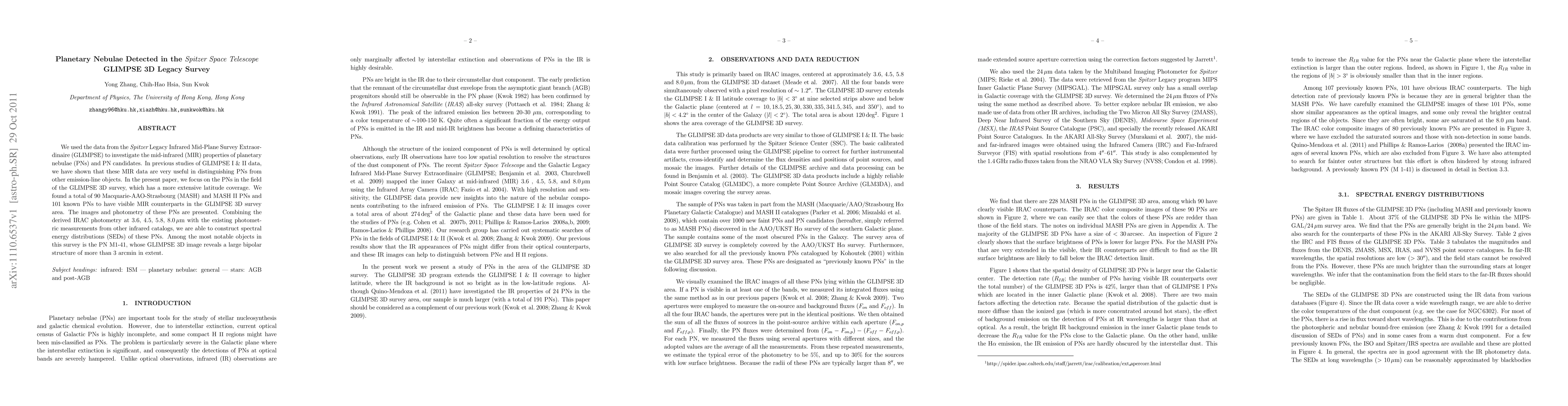 This study utilizes Spitzer GLIMPSE 3D survey data to analyze the mid-infrared properties of planetary nebulae (PNs), identifying 90 new and 101 known PNs with visible MIR counterparts. Spectral energy distributions (SEDs) are constructed using IRAC photometry and existing infrared measurements, highlighting PN M1-41 with a large bipolar structure.
