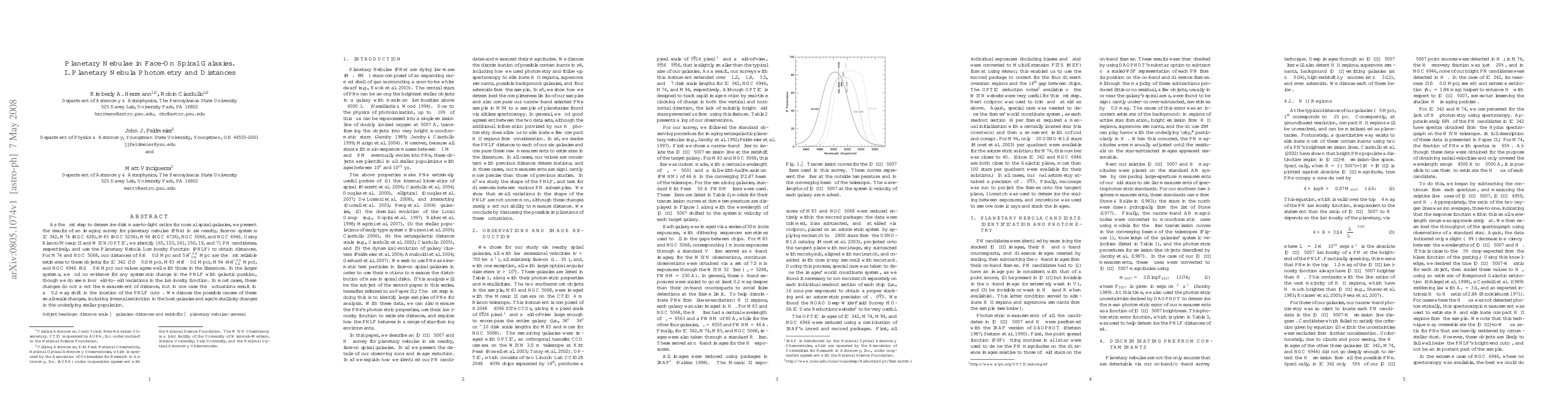As the first step to determine disk mass-to-light ratios for normal spiral galaxies, we present the results of an imaging survey for planetary nebulae (PNe) in six nearby, face-on systems: IC 342, M74 (NGC 628), M83 (NGC 5236), M94 (NGC 4736), NGC 5068, and NGC 6946. Using Blanco/Mosaic II and WIYN/OPTIC, we identify 165, 153, 241, 150, 19, and 71 PN candidates, respectively, and use the Planetary Nebula Luminosity Function (PNLF) to obtain distances. For M74 and NGC 5068, our distances of 8.6 +/- 0.3 Mpc and 5.4 +0.2/-0.4 Mpc are the first reliable estimates to these objects; for IC 342 (3.5 +/- 0.3 Mpc), M83 (4.8 +/- 0.1 Mpc), M94 (4.4 +0.1/-0.2 Mpc), and NGC 6946 (6.1 +/- 0.6 Mpc) our values agree well with those in the literature. In the larger systems, we find no evidence for any systematic change in the PNLF with galactic position, though we do see minor field-to-field variations in the luminosity function. In most cases, these changes do not affect the measurement of distance, but in one case the fluctuations result in a ~0.2 mag shift in the location of the PNLF cutoff. We discuss the possible causes of these small-scale changes, including internal extinction in the host galaxies and age/metallicity changes in the underlying stellar population.