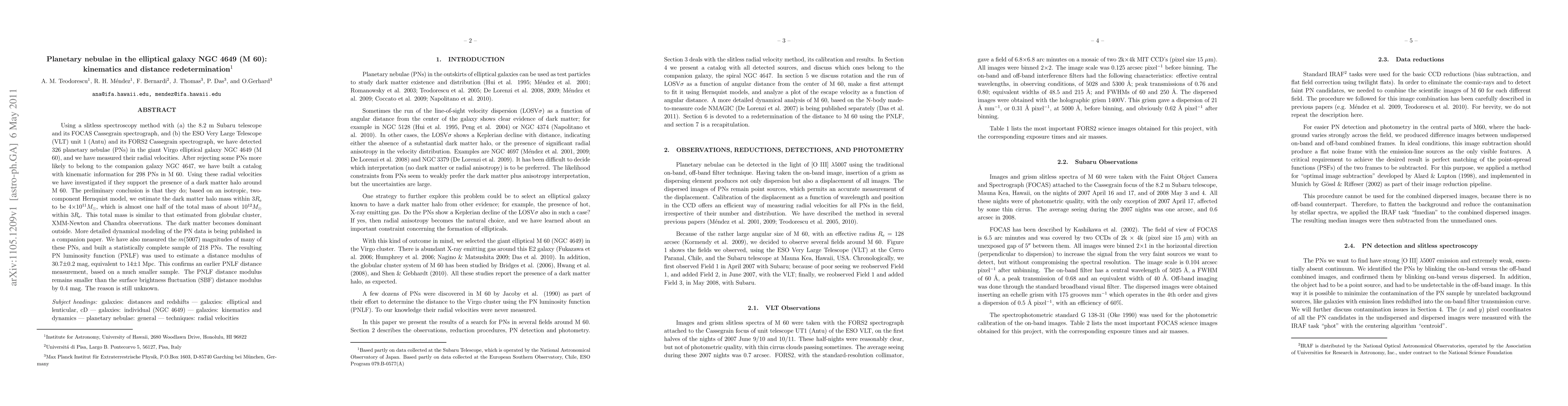 This study uses slitless spectroscopy from the Subaru and VLT telescopes to detect and analyze 326 planetary nebulae in NGC 4649, revealing a dark matter halo mass of 4$\times10^{11} M_{\odot}$ within 3$R_{\rm e}$. The planetary nebula luminosity function (PNLF) method estimates the galaxy's distance at 14$\pm$1 Mpc, confirming previous PNLF measurements but differing from surface brightness fluctuation (SBF) estimates.
