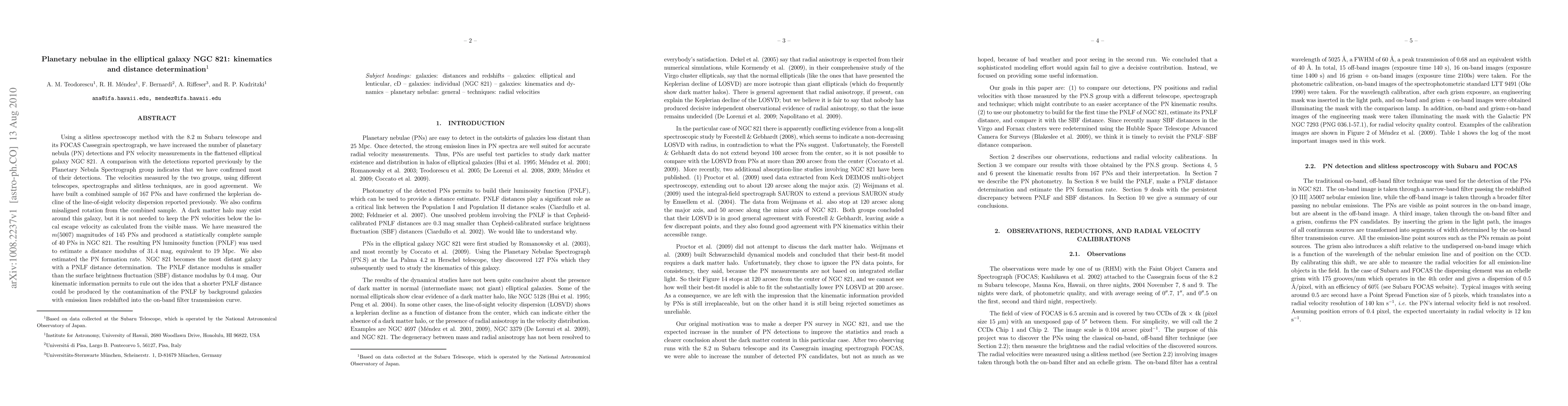 This study uses slitless spectroscopy from the Subaru telescope to analyze planetary nebulae in NGC 821, confirming previous detections and measuring velocities. The PN luminosity function (PNLF) was used to determine a distance modulus of 31.4 mag, placing NGC 821 at 19 Mpc, making it the most distant galaxy with such a determination.