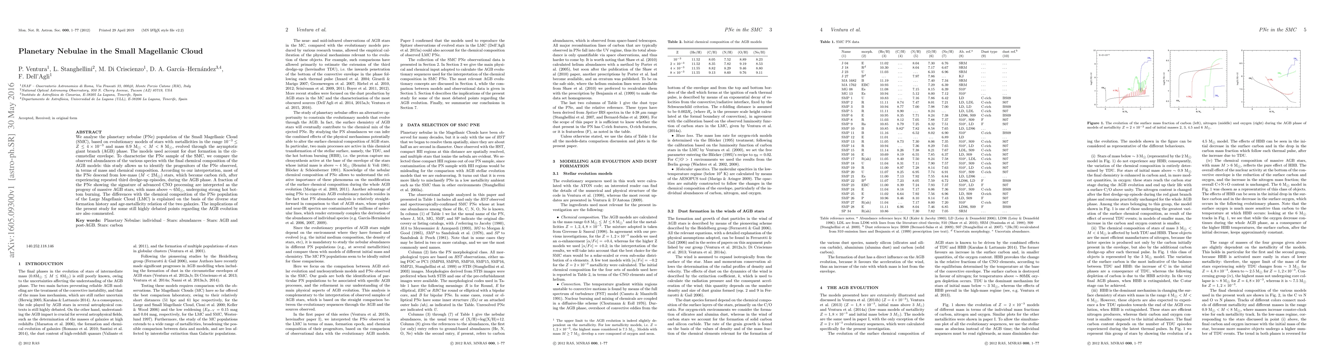 We analyse the planetary nebulae (PNe) population of the Small Magellanic Cloud (SMC), based on evolutionary models of stars with metallicities in the range $10^{-3} \leq Z \leq 4\times 10^{-3}$ and mass $0.9 M\odot < M < 8M\odot$, evolved through the asymptotic giant branch (AGB) phase. The models used account for dust formation in the circumstellar envelope. To characterise the PNe sample of the SMC, we compare the observed abundances of the various species with the final chemical composition of the AGB models: this study allows us to identify the progenitors of the PNe observed, in terms of mass and chemical composition. According to our interpretation, most of the PNe descend from low-mass ($M < 2 M\odot$) stars, which become carbon rich, after experiencing repeated third dredge-up episodes, during the AGB phase. A fraction of the PNe showing the signature of advanced CNO processing are interpreted as the progeny of massive AGB stars, with mass above $\sim 6 M\odot$, undergoing strong hot bottom burning. The differences with the chemical composition of the PNe population of the Large Magellanic Cloud (LMC) is explained on the basis of the diverse star formation history and age-metallicity relation of the two galaxies. The implications of the present study for some still highly debated points regarding the AGB evolution are also commented.