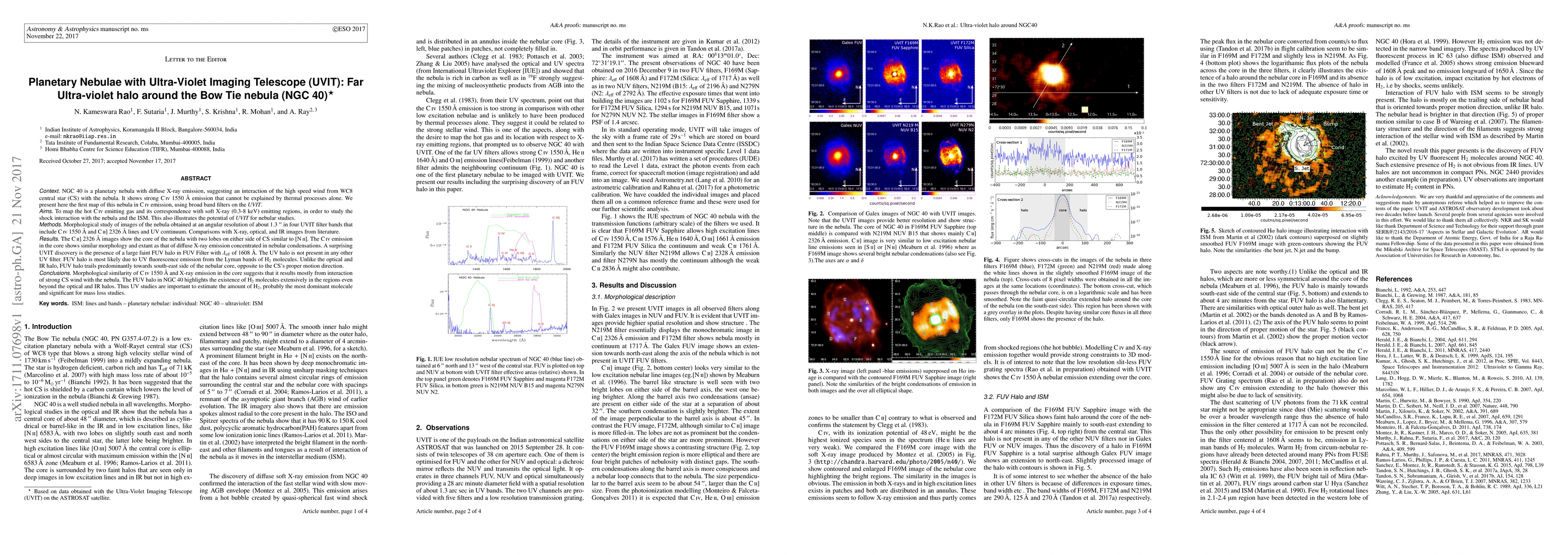 This paper uses UVIT imaging to map the planetary nebula NGC 40, revealing a large faint far-ultraviolet halo not seen in other UV filters, likely due to UV fluorescence from H2 molecules. The study finds that the C IV emission in the nebula's core correlates with soft X-ray regions, indicating strong shock interactions from the central star's wind.