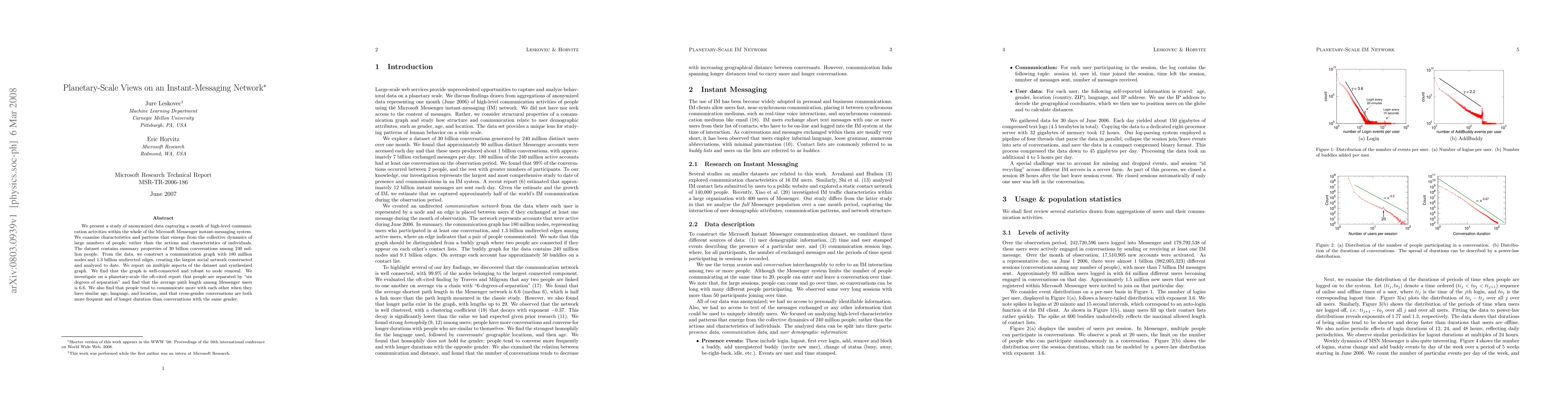 This study analyzes anonymized data from Microsoft Messenger, revealing large-scale communication patterns among 240 million users. The analysis finds a well-connected social network with an average path length of 6.6, supporting the "six degrees of separation" concept, and shows that similar age, language, and location enhance communication, while cross-gender conversations are more frequent and longer.