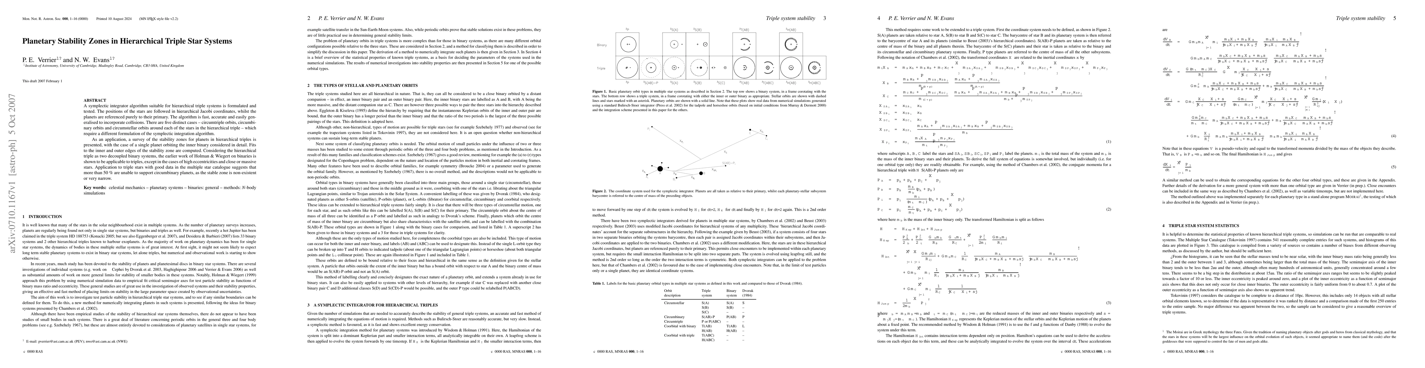 A symplectic integrator algorithm suitable for hierarchical triple systems is formulated and tested. The positions of the stars are followed in hierarchical Jacobi coordinates, whilst the planets are referenced purely to their primary. The algorithm is fast, accurate and easily generalised to incorporate collisions. There are five distinct cases -- circumtriple orbits, circumbinary orbits and circumstellar orbits around each of the stars in the hierarchical triple -- which require a different formulation of the symplectic integration algorithm. As an application, a survey of the stability zones for planets in hierarchical triples is presented, with the case of a single planet orbiting the inner binary considered in detail. Fits to the inner and outer edges of the stability zone are computed. Considering the hierarchical triple as two decoupled binary systems, the earlier work of Holman & Wiegert on binaries is shown to be applicable to triples, except in the cases of high eccentricities and close or massive stars. Application to triple stars with good data in the multiple star catalogue suggests that more than 50 per cent are unable to support circumbinary planets, as the stable zone is almost non-existent.
