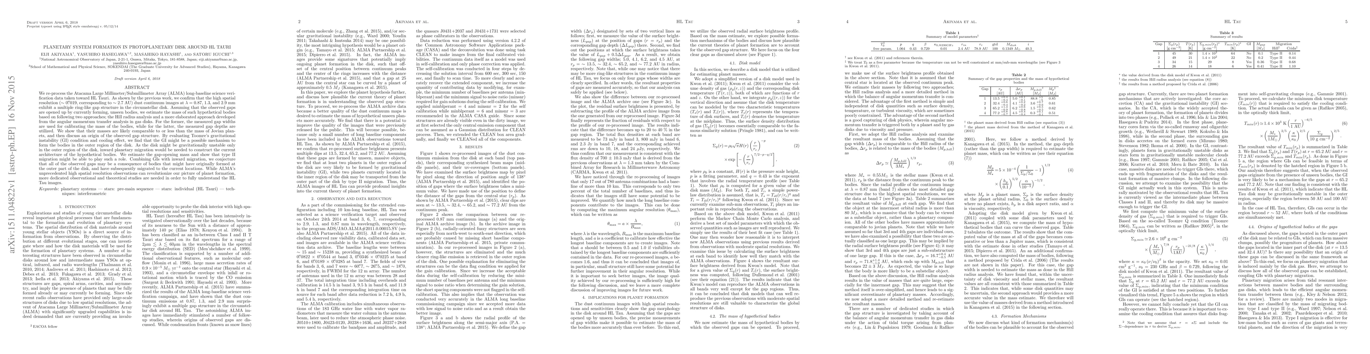 We re-process the Atacama Large Millimeter/Submillimeter Array (ALMA) long-baseline science verification data taken toward HL Tauri. As shown by the previous work, we confirm that the high spatial resolution (~ 0."019, corresponding to ~ 2.7 AU) dust continuum images at \lambda = 0.87, 1.3, and 2.9 mm exhibit a multiple ring-like gap structure in the circumstellar disk. Assuming that the observed gaps are opened up by currently forming, unseen bodies, we estimate the mass of such hypothetical bodies based on following two approaches; the Hill radius analysis and a more elaborated approach developed from the angular momentum transfer analysis in gas disks. For the former, the measured gap widths are used for calibrating the mass of the bodies, while for the latter, the measured gap depths are utilized. We show that their masses are likely comparable to or less than the mass of Jovian planets, and then discuss an origin of the observed gap structure. By evaluating Toomre's gravitational instability (GI) condition and cooling effect, we find that the GI might be a possible mechanism to form the bodies in the outer region of the disk. As the disk might be gravitationally unstable only in the outer region of the disk, inward planetary migration would be needed to construct the current architecture of the hypothetical bodies. We estimate the gap-opening mass and show that type II migration might be able to play such a role. Combining GIs with inward migration, we conjecture that all of the observed gaps may be a consequence of bodies that might have originally formed at the outer part of the disk, and have subsequently migrated to the current locations. While ALMA's unprecedented high spatial resolution observations can revolutionize our picture of planet formation, more dedicated observational and theoretical studies are needed in order to fully understand the HL Tau images.