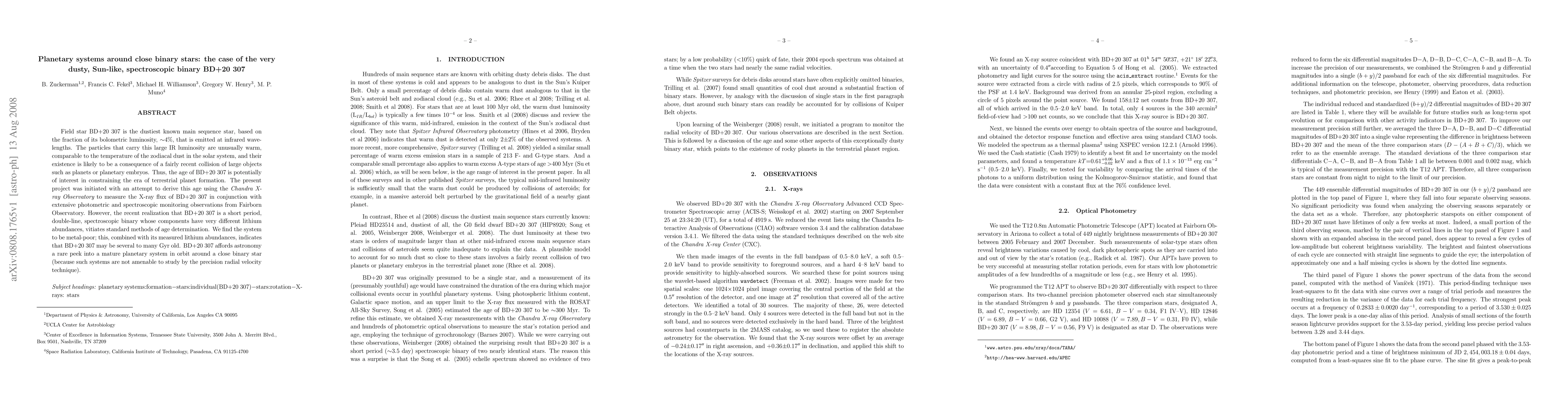 Field star BD+20 307 is the dustiest known main sequence star, based on the fraction of its bolometric luminosity, 4%, that is emitted at infrared wavelengths. The particles that carry this large IR luminosity are unusually warm, comparable to the temperature of the zodiacal dust in the solar system, and their existence is likely to be a consequence of a fairly recent collision of large objects such as planets or planetary embryos. Thus, the age of BD+20 307 is potentially of interest in constraining the era of terrestrial planet formation. The present project was initiated with an attempt to derive this age using the Chandra X-ray Observatory to measure the X-ray flux of BD+20 307 in conjunction with extensive photometric and spectroscopic monitoring observations from Fairborn Observatory. However, the recent realization that BD+20 307 is a short period, double-line, spectroscopic binary whose components have very different lithium abundances, vitiates standard methods of age determination. We find the system to be metal-poor; this, combined with its measured lithium abundances, indicates that BD+20 307 may be several to many Gyr old. BD+20 307 affords astronomy a rare peek into a mature planetary system in orbit around a close binary star (because such systems are not amenable to study by the precision radial velocity technique).