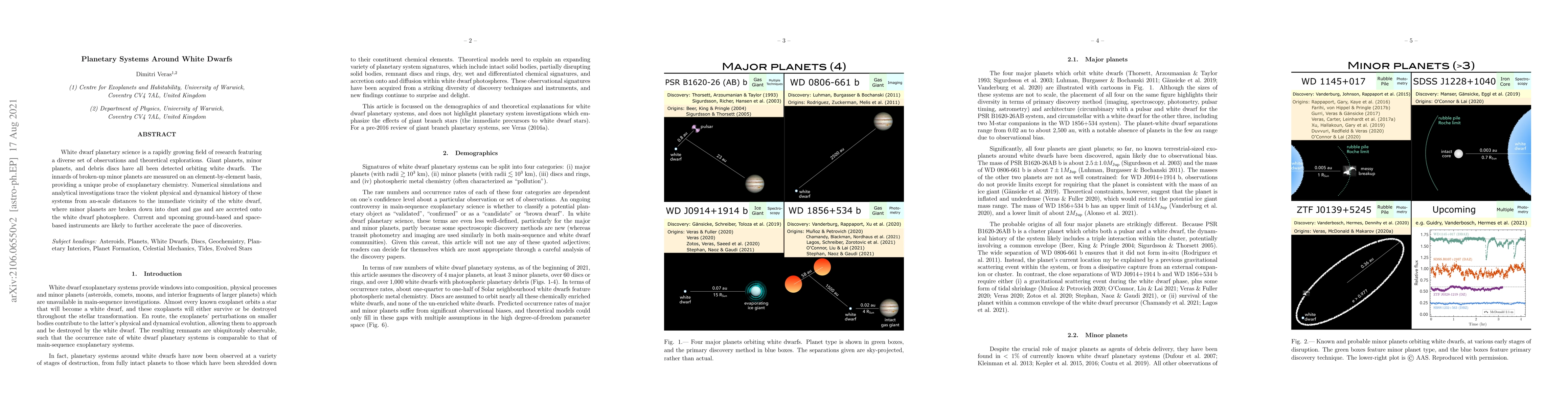 White dwarf planetary science is a rapidly growing field of research featuring a diverse set of observations and theoretical explorations. Giant planets, minor planets, and debris discs have all been detected orbiting white dwarfs. The innards of broken-up minor planets are measured on an element-by-element basis, providing a unique probe of exoplanetary chemistry. Numerical simulations and analytical investigations trace the violent physical and dynamical history of these systems from au-scale distances to the immediate vicinity of the white dwarf, where minor planets are broken down into dust and gas and are accreted onto the white dwarf photosphere. Current and upcoming ground-based and space-based instruments are likely to further accelerate the pace of discoveries.