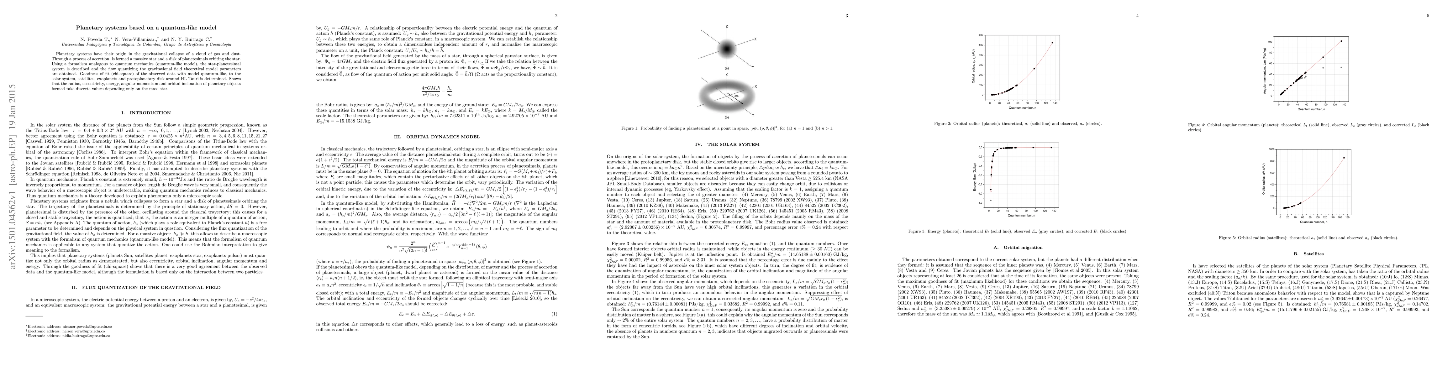 Planetary systems have their origin in the gravitational collapse of a cloud of gas and dust. Through a process of accretion, is formed a massive star and a disk of planetesimals orbiting the star. Using a formalism analogous to quantum mechanics (quantum-like model), the star-planetesimal system is described and the flow quantizing the gravitational field theoretical model parameters are obtained. Goodness of fit (chi-square) of the observed data with model quantum-like, to the solar system, satellites, exoplanets and protoplanetary disk around HL Tauri is determined. Shows that the radius, eccentricity, energy, angular momentum and orbital inclination of planetary objects formed take discrete values depending only on the mass star.
