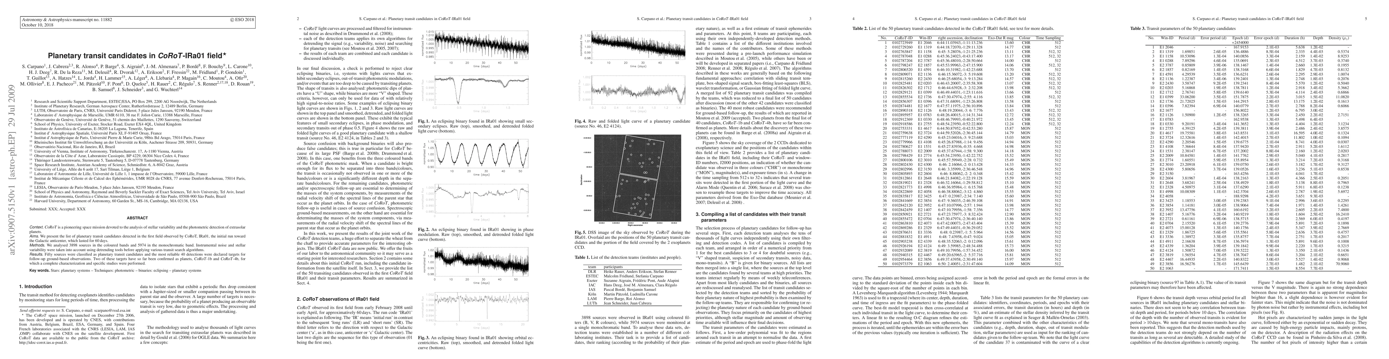 The CoRoT mission identified planetary transit candidates in the IRa01 field, analyzing 3898 sources in coloured bands and 5974 in a monochromatic band. Fifty candidates were found, with 40 selected for ground-based follow-up, confirming two as planets, COROT-1b and COROT-4b.