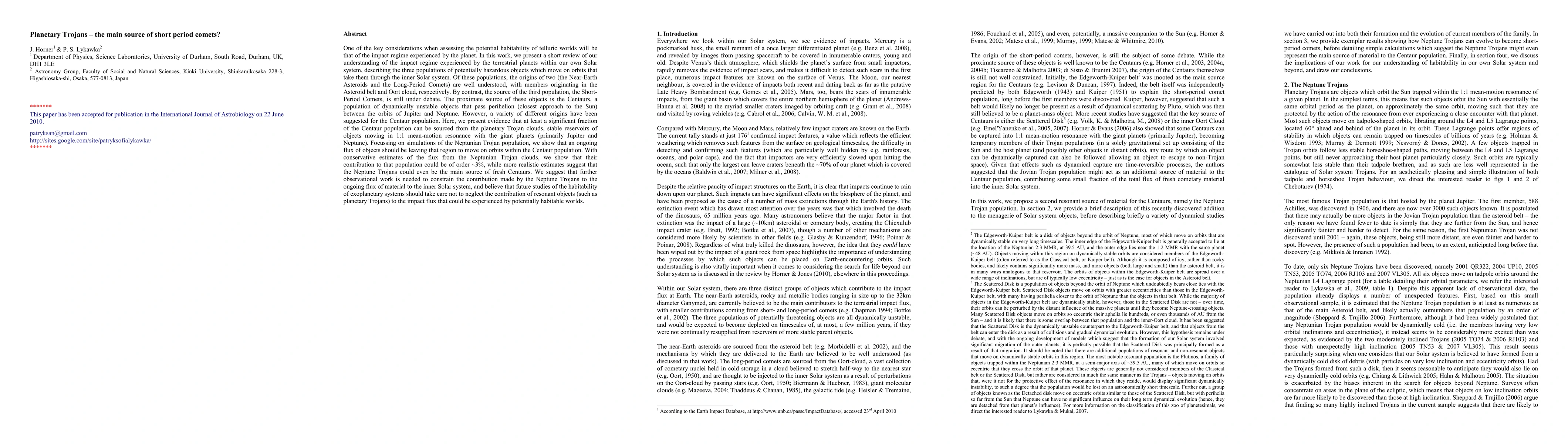 This paper reviews the origins of short-period comets, suggesting that a significant fraction of the Centaur population, which feeds these comets, may originate from the Neptunian Trojan clouds. The study proposes that these Trojans could be a major source of fresh Centaurs and calls for further observations to better understand their contribution to the inner Solar System's impact flux.