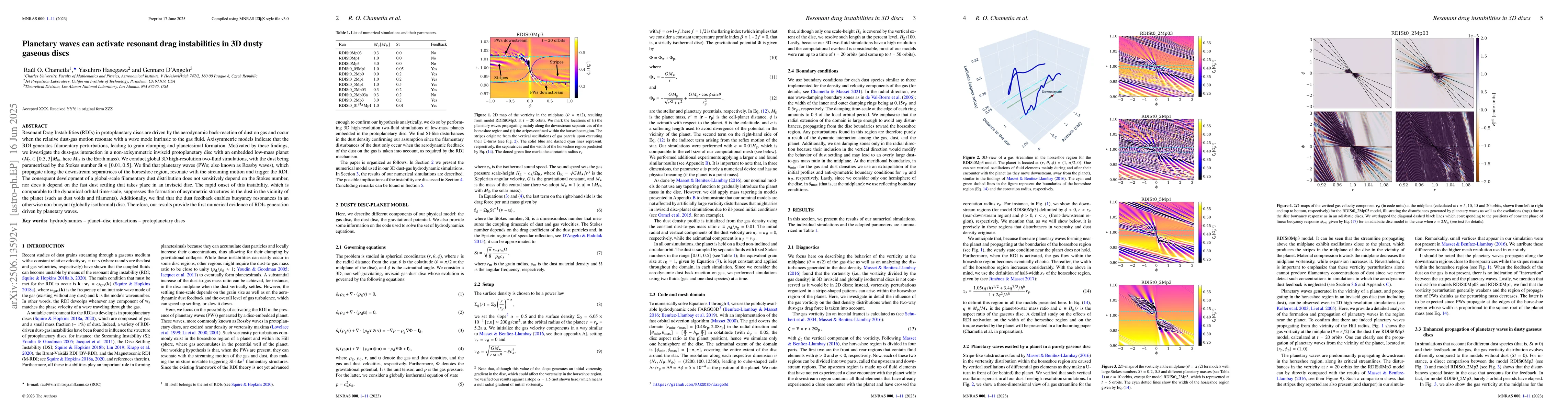 Resonant Drag Instabilities (RDIs) in protoplanetary discs are driven by the aerodynamic back-reaction of dust on gas and occur when the relative dust-gas motion resonate with a wave mode intrinsic to the gas fluid. Axisymmetric models indicate that the RDI generates filamentary perturbations, leading to grain clumping and planetesimal formation. Motivated by these findings, we investigate the dust-gas interaction in a non-axisymmetric inviscid protoplanetary disc with an embedded low-mass planet ($M_{\mathrm{p}}\in[0.3, 3] M_\oplus$, here $M_\oplus$ is the Earth mass). We conduct global 3D high-resolution two-fluid simulations, with the dust being parametrized by the Stokes number $\mathrm{St}\in[0.01,0.5]$. We find that planetary waves (PWs; also known as Rossby waves), which propagate along the downstream separatrices of the horseshoe region, resonate with the streaming motion and trigger the RDI. The consequent development of a global-scale filamentary dust distribution does not sensitively depend on the Stokes number, nor does it depend on the fast dust settling that takes place in an inviscid disc. The rapid onset of this instability, which is comparable to the dynamical orbital time-scale, suppresses the formation of asymmetric structures in the dust in the vicinity of the planet (such as dust voids and filaments). Additionally, we find that the dust feedback enables buoyancy resonances in an otherwise non-buoyant (globally isothermal) disc. Therefore, our results provide the first numerical evidence of RDIs generation driven by planetary waves.