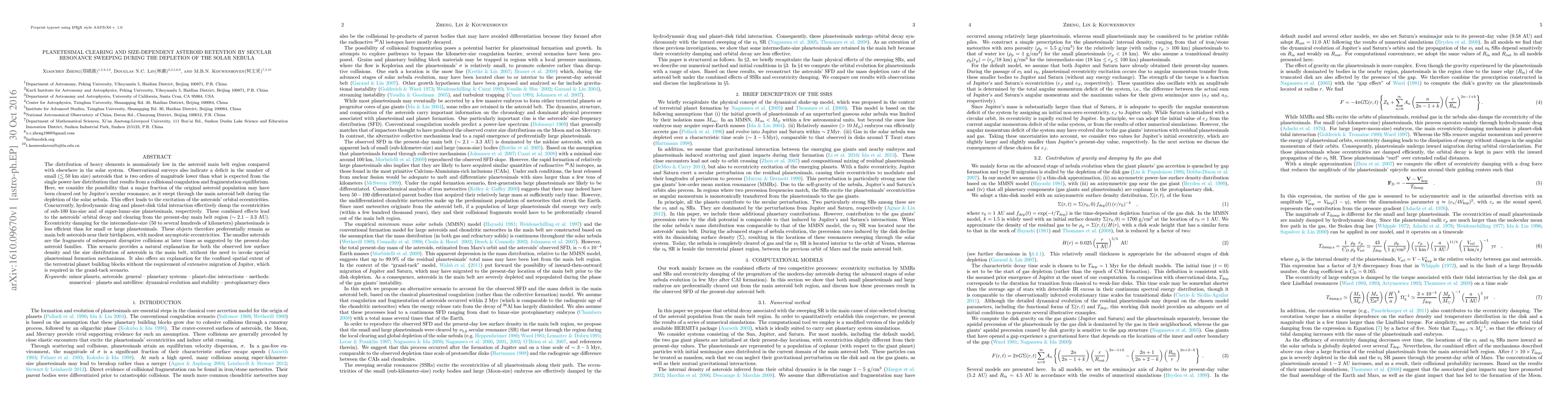 This paper proposes that Jupiter's secular resonance sweeping through the asteroid belt cleared out a major fraction of small asteroids during the solar nebula's depletion, leading to the observed low density and size distribution of asteroids. Larger planetesimals remain in the main belt, while smaller fragments resulted from later collisions.